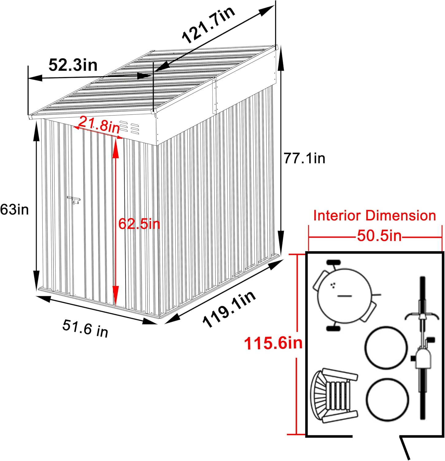 - Dimensions - The overall size of assembled outdoor storage shed: 51.6"W x 119.1"D x 77.1"H. Interior size: 50.5"W x 115.6"D. Door size: 21.8"W x 62.5"H. Make sure you are permitted to build a shed from your local before purchase.
