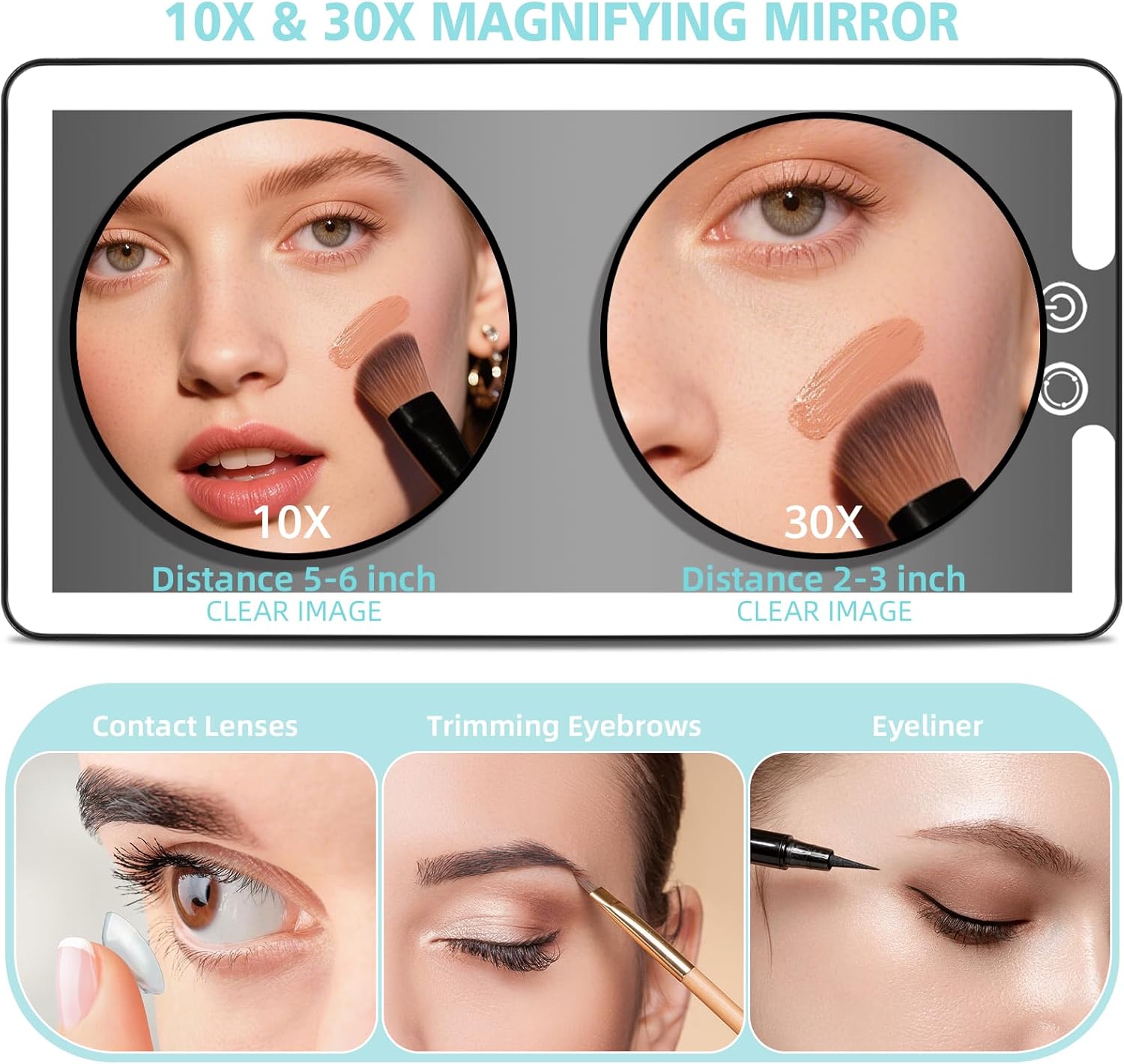 - ăMakeup Mirror With 10x and 30x magnificationă Our visor makeup mirror has a large mirror surface and a wide field of view, allowing you to view the overall effect of your makeup after applying it; not only that, we also equipped it with 10X and 30x magnifying mirror, whether you are touching up your makeup, retouching your eyebrows or retouching your eyeliner. The ultra-clear reflection ensures that every detail is clear and realistic, making it an indispensable tool for makeup enthusiasts and professionals.