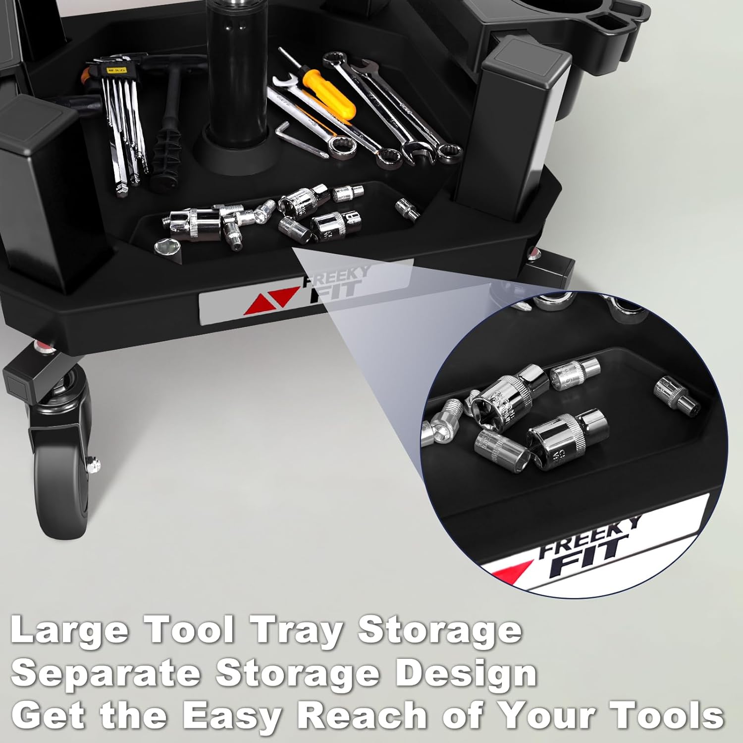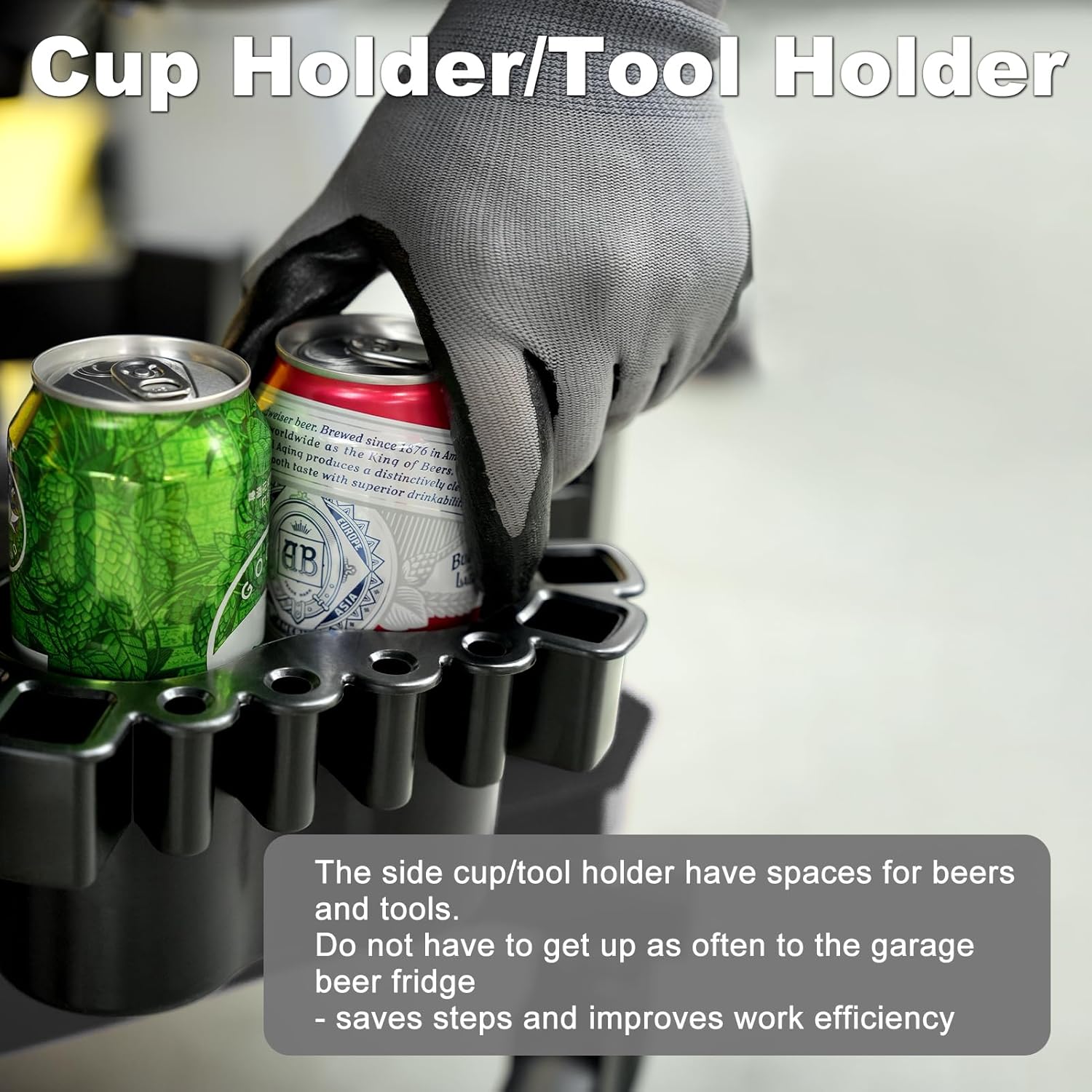 - ăONE tool tray & TWO cup holders/tool holdersăThe garage stool has a very good storage function. There is a tool tray and two cup holders/tool holders. At the same time, the tool tray is equipped with a small partition space. You can put small tools like screws here. When you move, do not worry about the screws slipping out of range. It is convenient to store and access necessary tools and parts at anytime