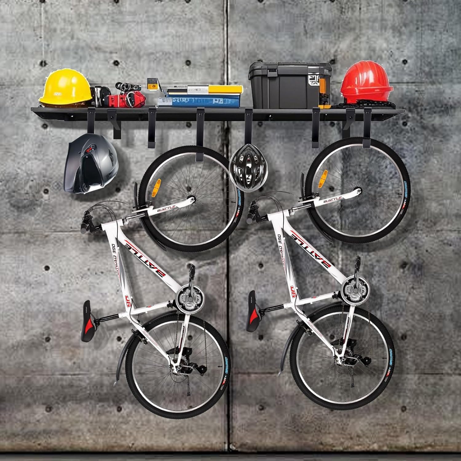 - Multiple use and Good Load Capacity : Holds 520 LBS capacity ,Each garage shelf supports up to 260 lbs. Our garage wall rack perfect for holding storage bins, boxes, tires, tools, and more. Each garage shelf come with 2pcs large and 4pcs small hanging hooks for hanging a bike, bags,roller skates, rope garden tools, hoses, cords, and other gear below the shelves