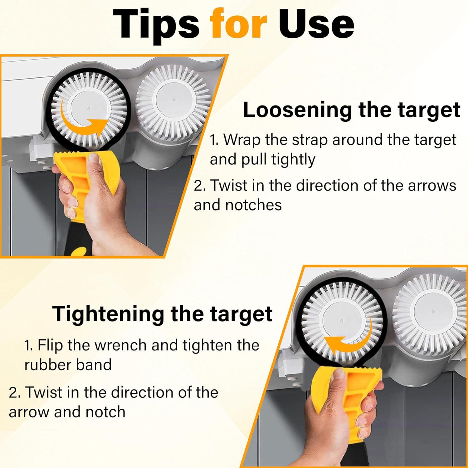 - Tips for Use: This strap wrench is easy to operate, simply wrap the strap around the target, thread through the handle and adjust to the proper diameter. To loosen the target, turn the wrench in the direction of the arrow; to tighten, flip the wrench over and repeat