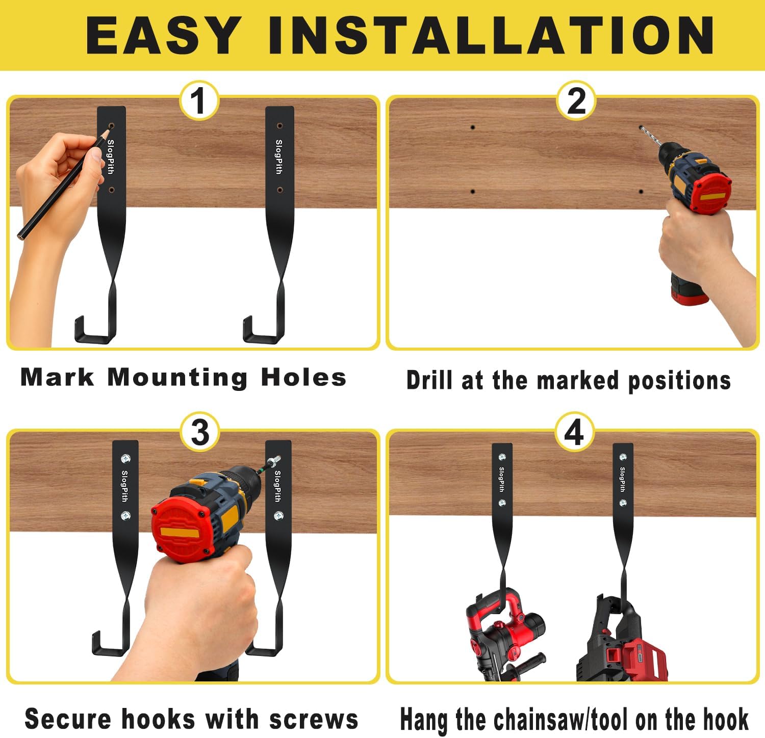 - Quick & Secure InstallationďźâIncludes screws and pre-drilled holes for âeffortless setup, add a spacer (like 2x4 wood) to create hanging space, mounts on walls, rafters, or cabinetsâchainsaw wall mounted stability in minutes