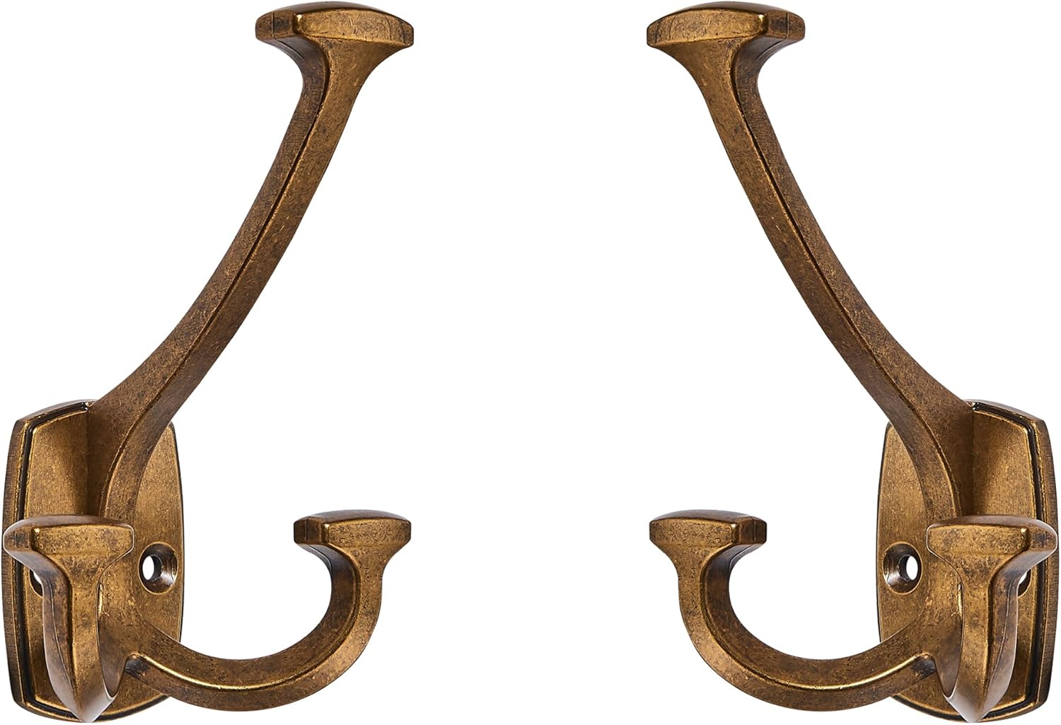 Large Wall Double-Sided Hook 2 Pack Antique Brass Hook Decorative Heavy Duty Solid Large Coat Hooks for Towel Hanging Coats Robe Towel Bags Door Back 2 Prong Hooks