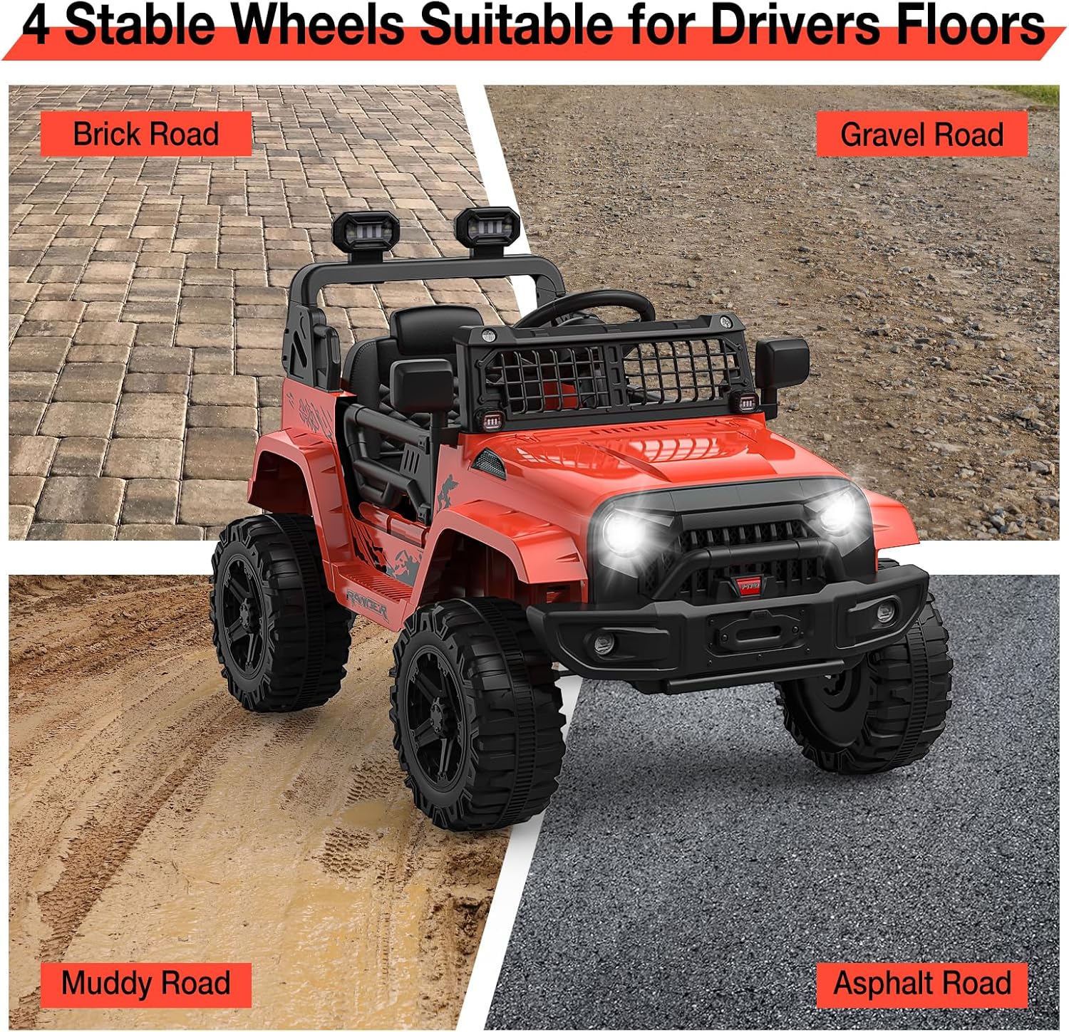 - β‘ 12V Power & All-Terrain Performance: High-torque 12V motor with puncture-proof tires conquers grass/concrete/driveways. LED headlights ensure nighttime visibility.