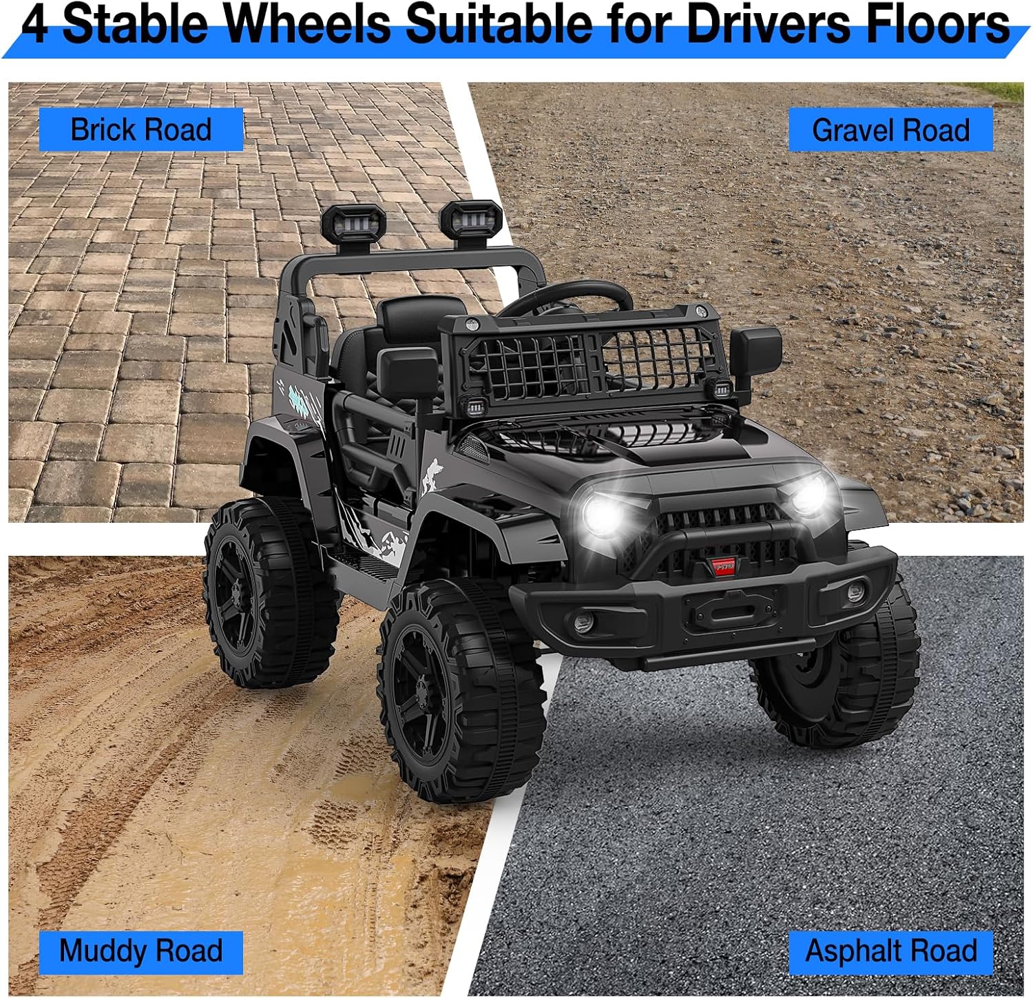 - β‘ 12V Power & All-Terrain Performance: High-torque 12V motor with puncture-proof tires conquers grass/concrete/driveways. LED headlights ensure nighttime visibility.