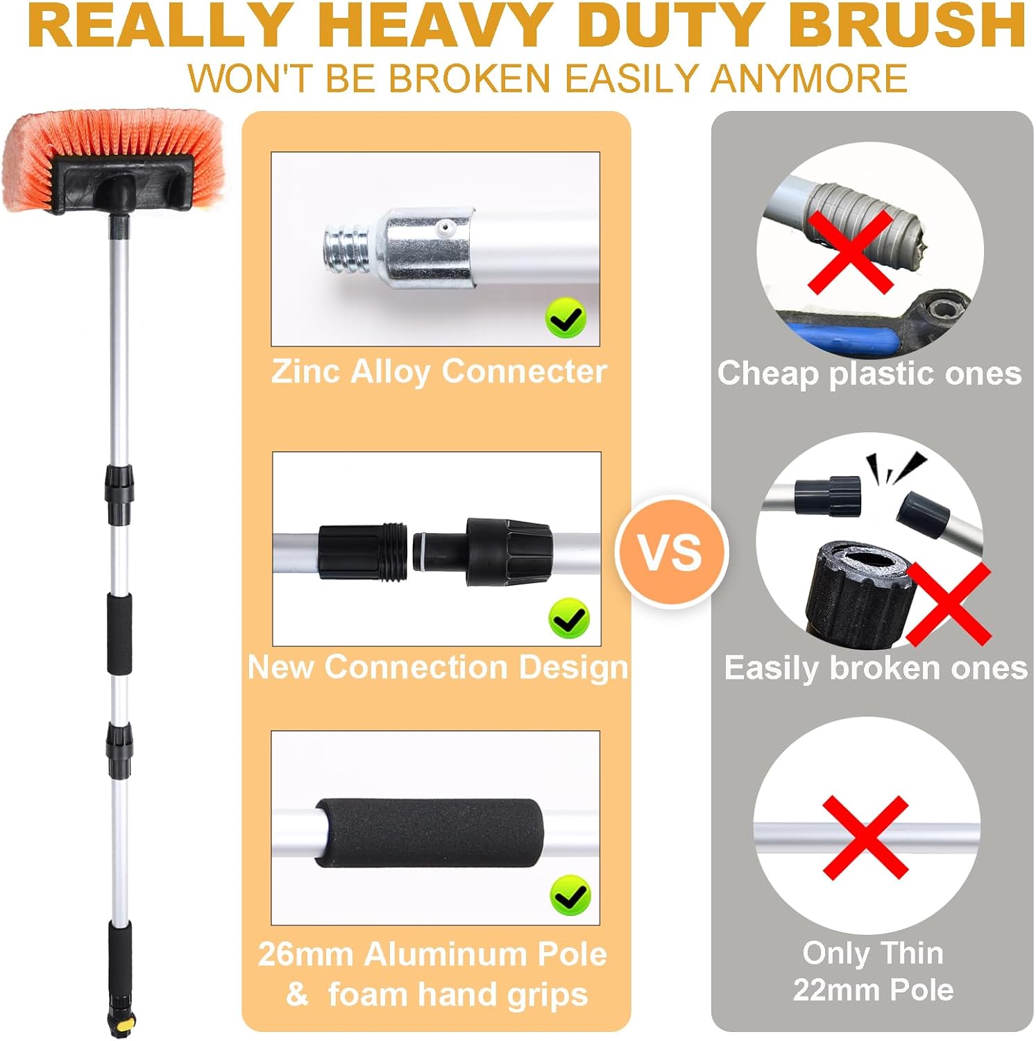 - 【 2 in 1 Car Wash Brush 】This car wash brush can be used as a Dip Brush directly, or as a Flow Thru Brush to make your car washing more efficient. You just need to connect the pole to your garden hose, then you can wash and rinse your vehicle at the same time. It is multifunctional and practical too, perfect for cleaning or washing Solar Panels, House Siding, Auto Cars, Trucks, SUV, RV, Camper, Boats, Decks, Floors, Patios, Bathrooms, Showers, Snow Removal and more!