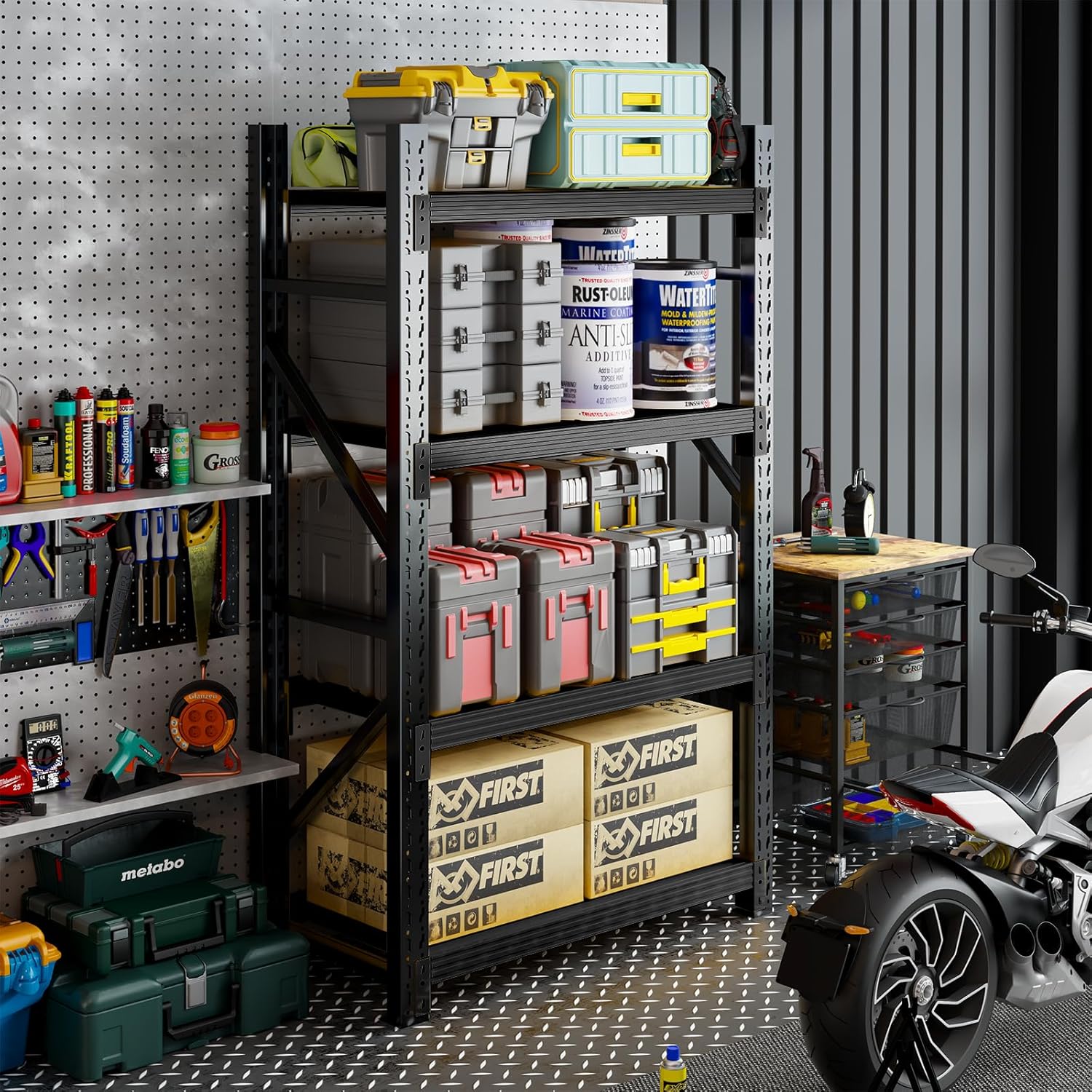 - ăTriple ReinforcementăDesigned for heavy-duty storage needs, this rack features reinforced support beams, a triangular structure, and secure reinforcement buckles, ensuring exceptional stability and durability. Perfect for storing power tools, paint cans, large bins, gardening supplies, and automotive parts, keeping your space organized and clutter-free.