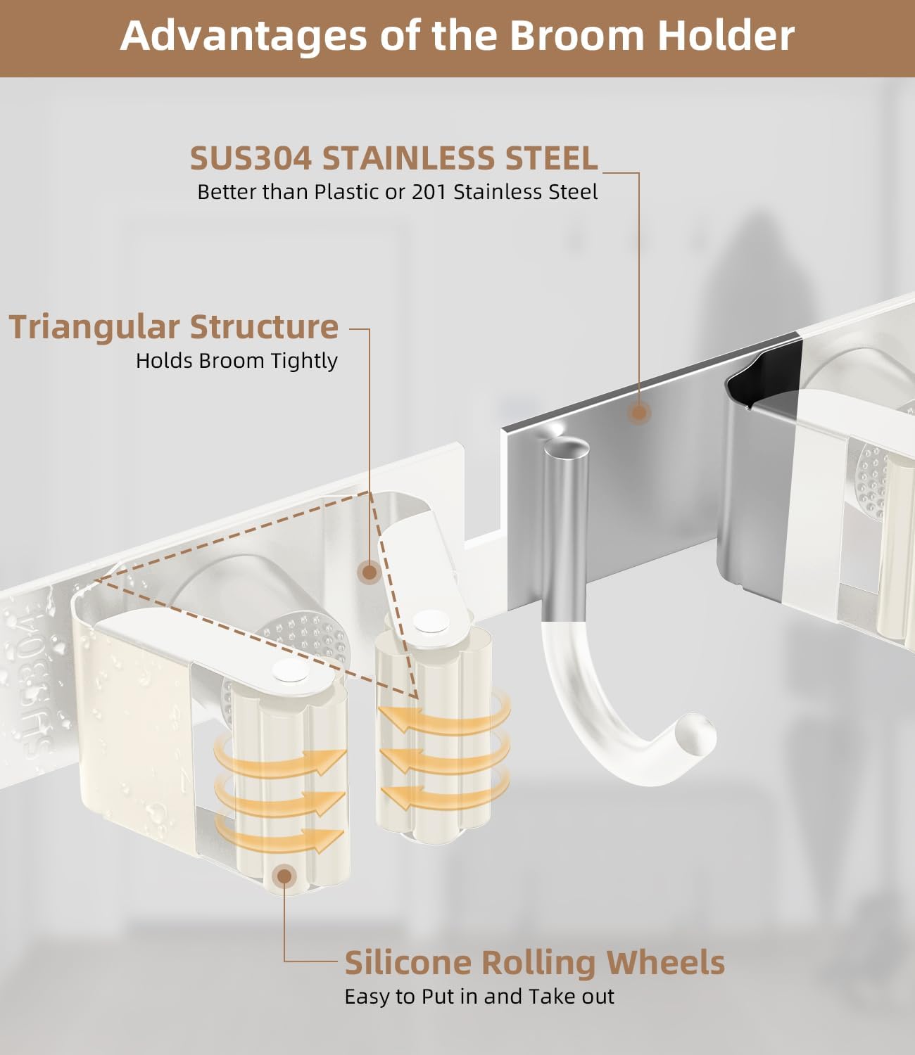 - 304 STAINLESS STEEL , ANTI-RUST & STURDY: The mop and broom holder wall mount is made of 304 stainless steel, making it corrosion-resistant, moisture-proof, and waterproof. Compared with plastic broom racks, it is stronger and more premium quality. This garage organization can hold up to 35 pounds when installed with screws, and the hook can also support your steam mop.