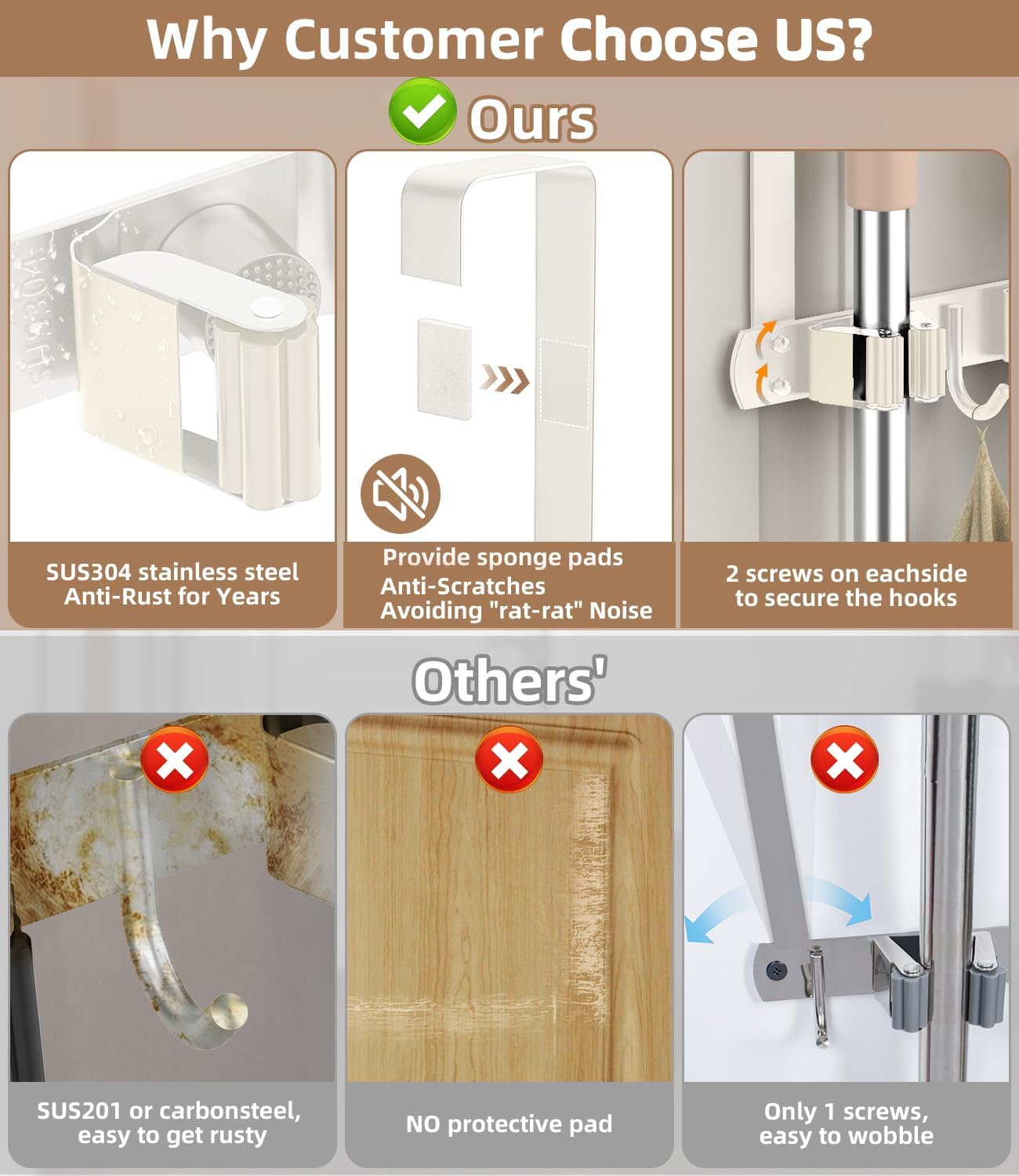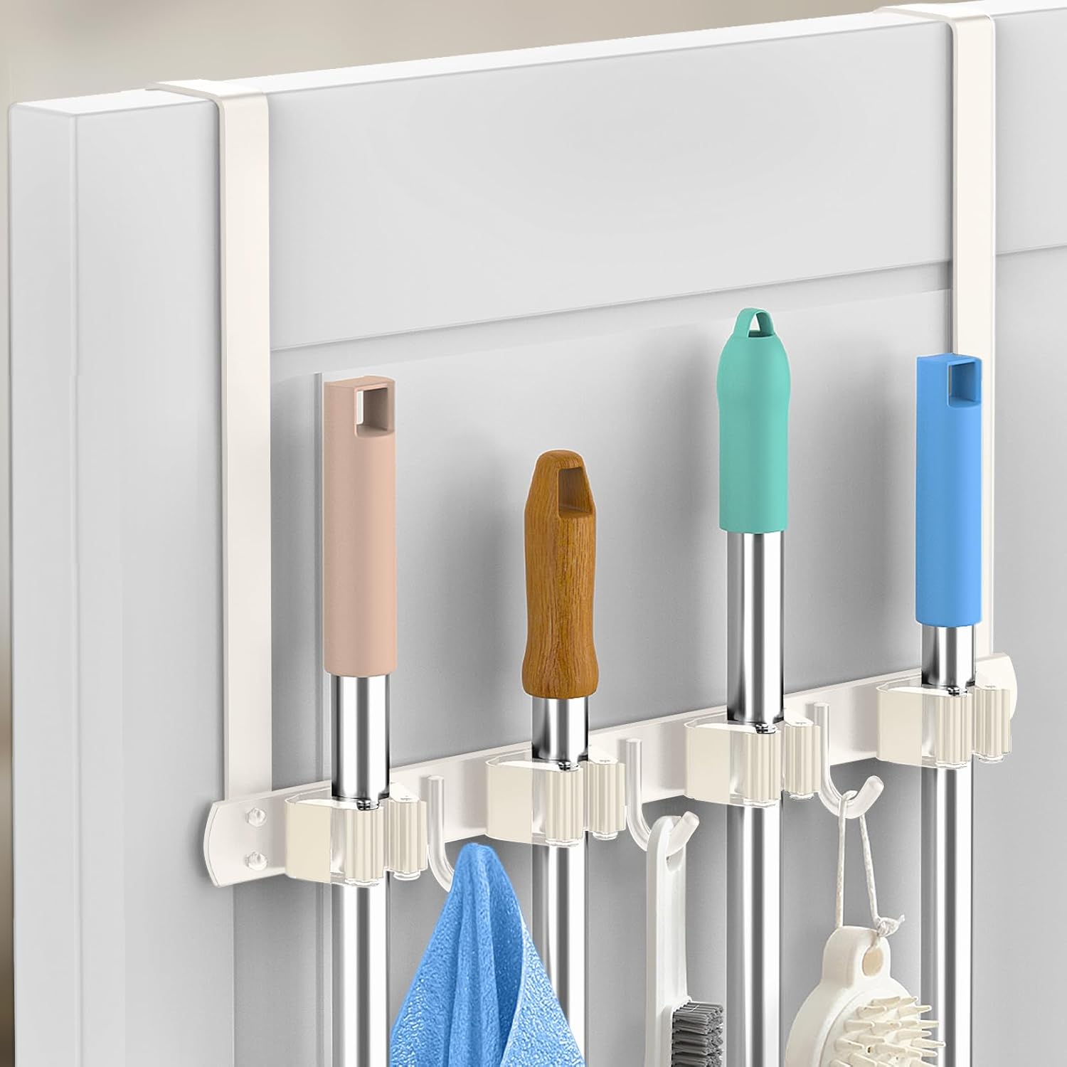 - [Patent] HIDE YOUR TOOLS BEHIND THE DOOR: This specially designed Over-the-Door Broom Holder comes with two over-door hooks, eliminating the need for drilling. This drill-free design allows you to utilize the space behind the door, making it a versatile and damage-free solution. Maximize efficiency and eliminate floor clutter by organizing brooms, mops, and other cleaning tools. (This metal broom holder also comes with Anti-Scratch self-adhesive SPONGE PADS to reduce Rat-Rat noice and protect your door.)
