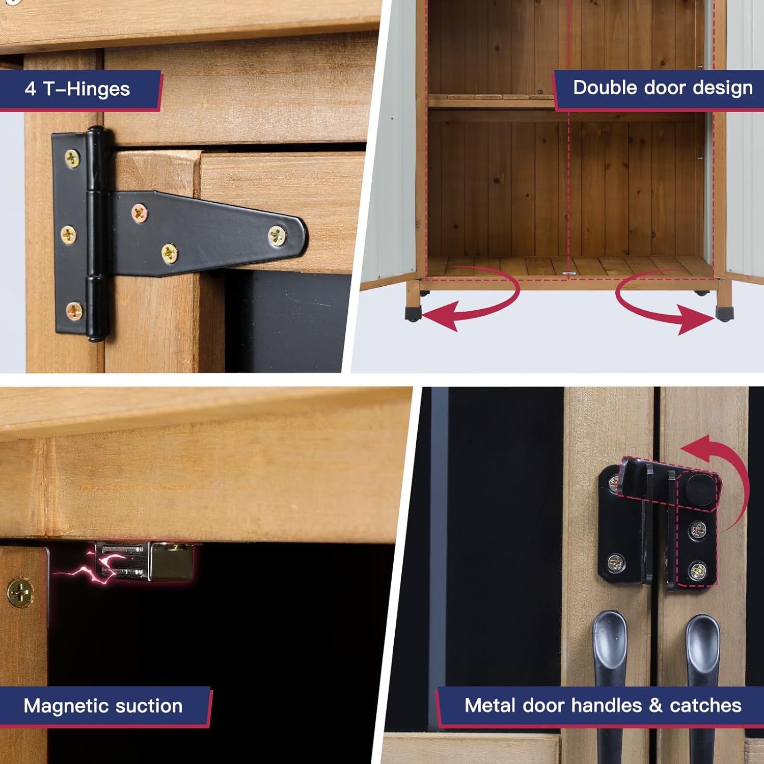 Wood & Metal Outdoor Storage Cabinet with Waterproof Roof, Garden Tool Shed with 4 T-Hinge, 4 Adjustable feet and Magnetic Door, 2 Removable Shelves, Easy Installation, 13.5" D x 34.5" W x 39" H
