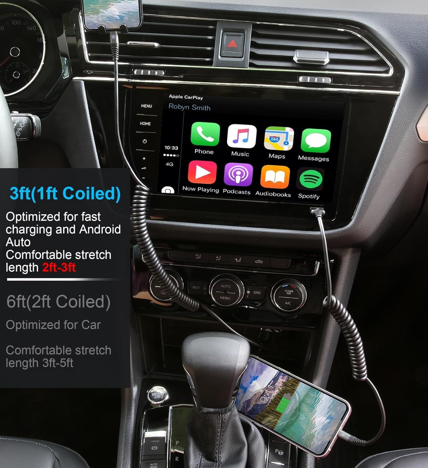 - Elastic Coiled Lightning Cable : Coiled lightning cable 3FT (stretchable to 4.8FT, comfortable stetch length 2ft-3ft) coiled lightning cable 6FT (stretchable to 6.5FT, comfortable stetch length 3ft-5ft) and bounce back to normal length. If you use CarPlay and store your iPhone in a cubicle, we recommend using 3ft; if you use your device lying on the couch while you are charging, you can choose 6ft. iPhone charging cable 3ft and 6ft can meet your different needs.