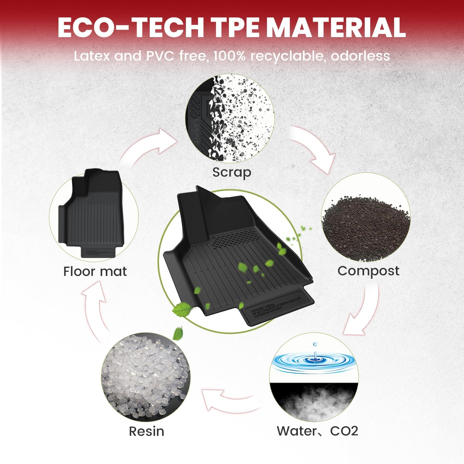 - TPE Environment Friendly - Lasfit for tesla model y juniper floor mats use inodorous recyclable elastic TPE material (Thermoplastic Elastomer) for a comfortable and soft touch and exquisite finish. More friendly to the elderly, children and pets. Anti-slip studs for more safety. Shock and Sound Absorbent