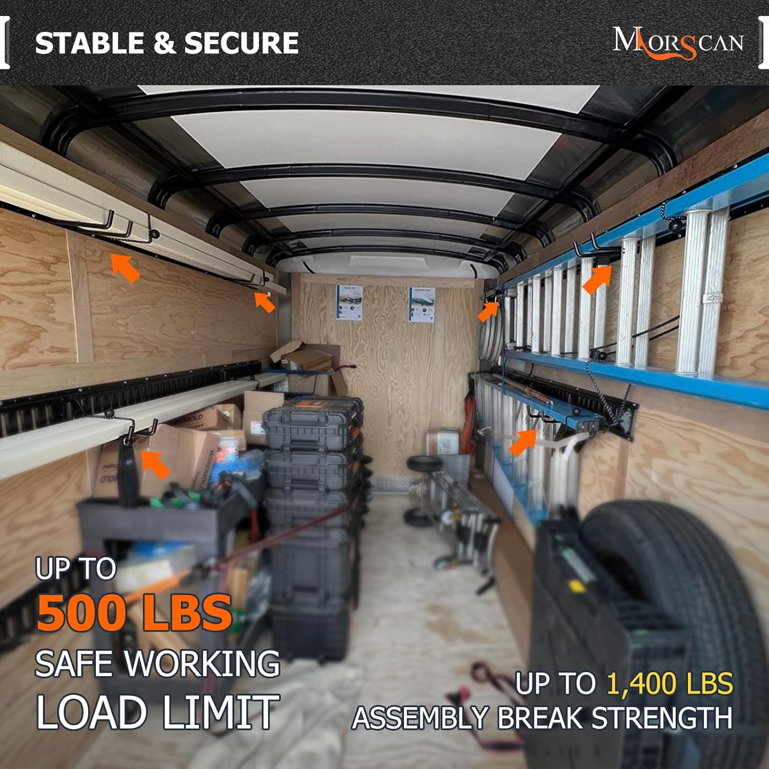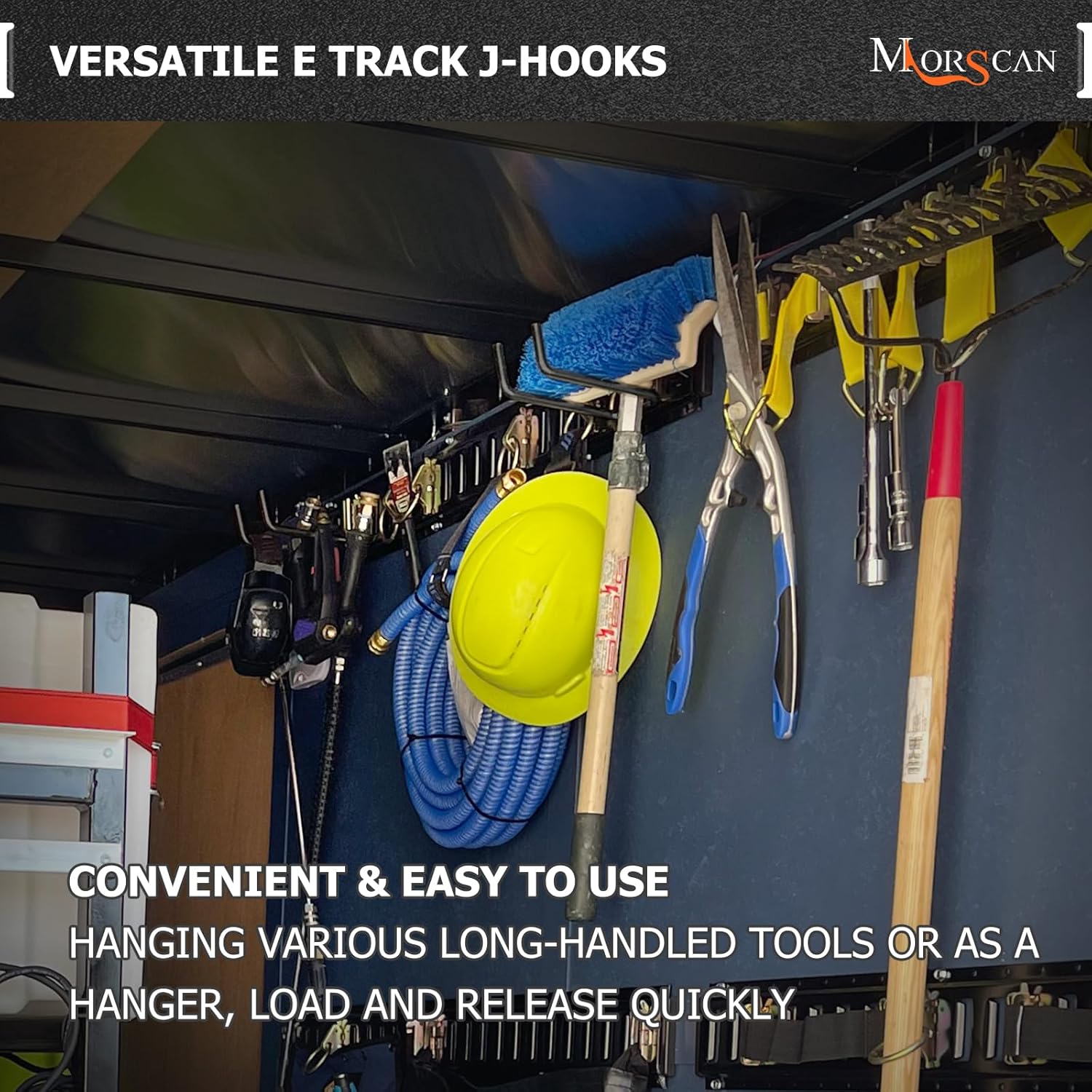 - VERSATILE HOOKS - Store multiple long-handled tools such as brooms, rakes, shovels, hay forks, garden tools and other hand tools with these J hook e track tie down anchor points. Used for Box Truck, Enclosed Trailer, Garage, Vans, Warehouse, Workshop, Garden etc.