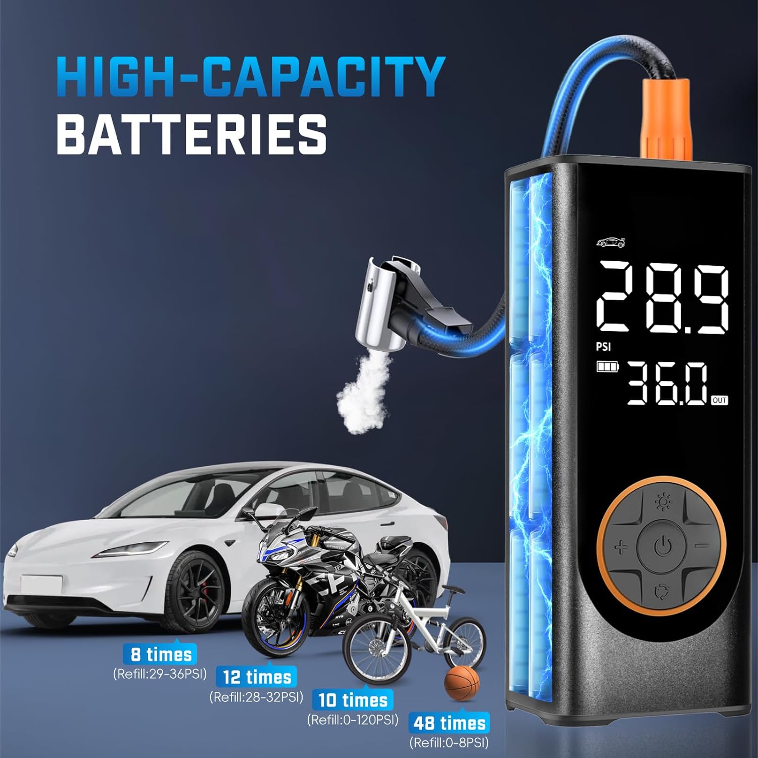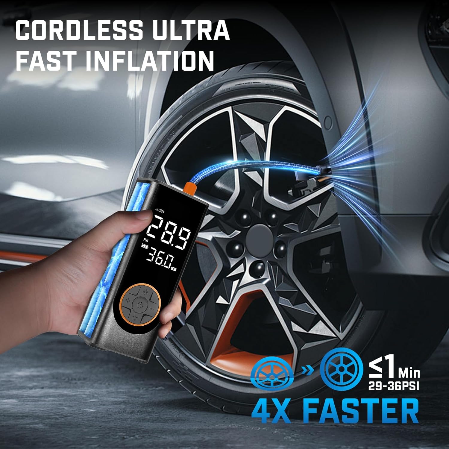- π 4X Fast Inflation & 5 Modes: This tire inflator portable air compressor delivers a maximum 150 PSI & 35 L/min airflow, inflating a car tire (29-36 PSI) in under 1 min. Features 4 preset modes: car, motorcycle, bike, and ball.