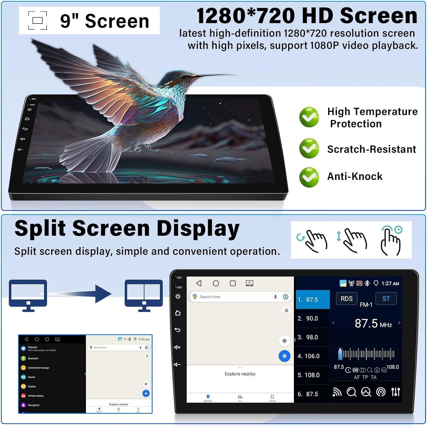 - Special Feature : Android 13, 4G+64G & 1280*720 HD Touch Screen and Split Screen, Backup Camera Input and Steering Wheel Control, Bluetooth 5.0 and FM/ RDS Radio, DSP Audio & EQ, WiFi & GPS/GLONASS/Beidou Navigation, Wireless Apple CarPlay and Android Auto, Mirror Link Android 13, 4G+64G & 1280*720 HD Touch Screen and Split Screen, Backup Camera Input and Steering Wheel Control, Bluetooth 5.0 and FM/ RDS Radio, DSP Audio & EQ, WiFi & GPS/GLONASS/Beidou Navigation, Wireless Apple C⌠See more