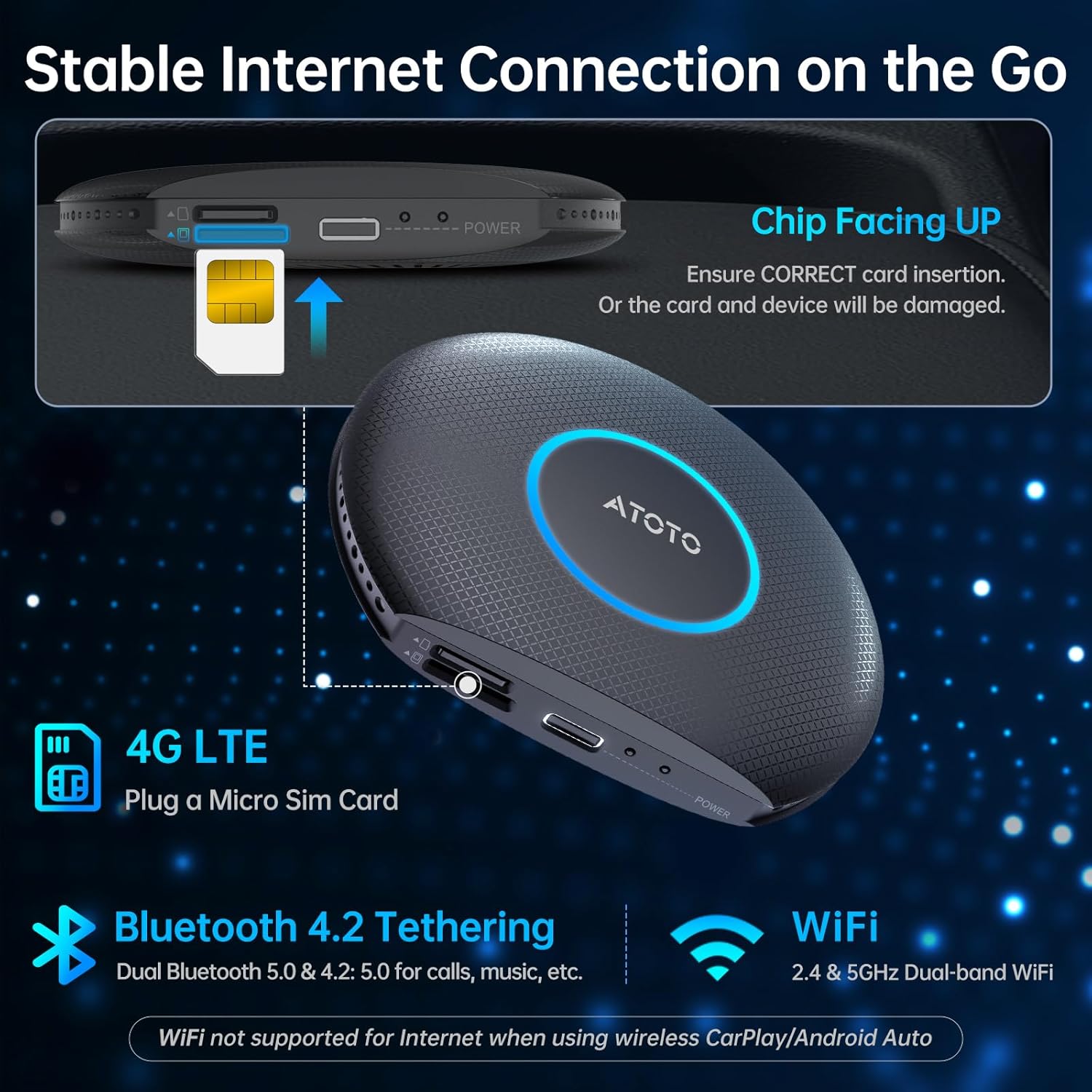 - NOTE: When using wireless CarPlay or Android Auto,Please note that, CB6 CarPlay box visits other internet is not supported during wireless CarPlay or Android Auto sessions, Please connect to the internet via the built-in 4G LTE, and Blue-tooth 2 as an alternative. Before installing the SIM cards to the CB6, some operators' SIM cards are needed to be activated using another device (such as a mobile phone) in advance