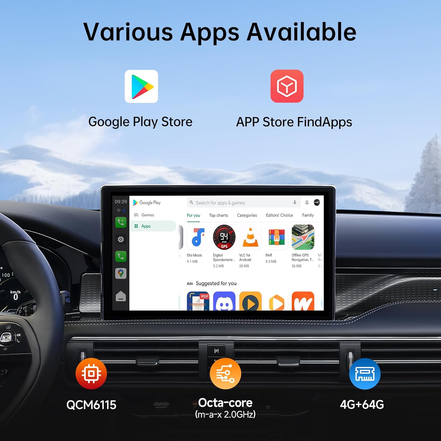 - Trip with Apps: Carplay wireless adapter Powered by SD662(SM6115), octa-core(M-A-X 2.0GHz), and 4GB+64GB, CB6 android auto adapter supports multiple Apps, such as GGLE Play Store to download apps, TrackHU to track vehicle's location. And dual-app operation is achieved via Split Screen