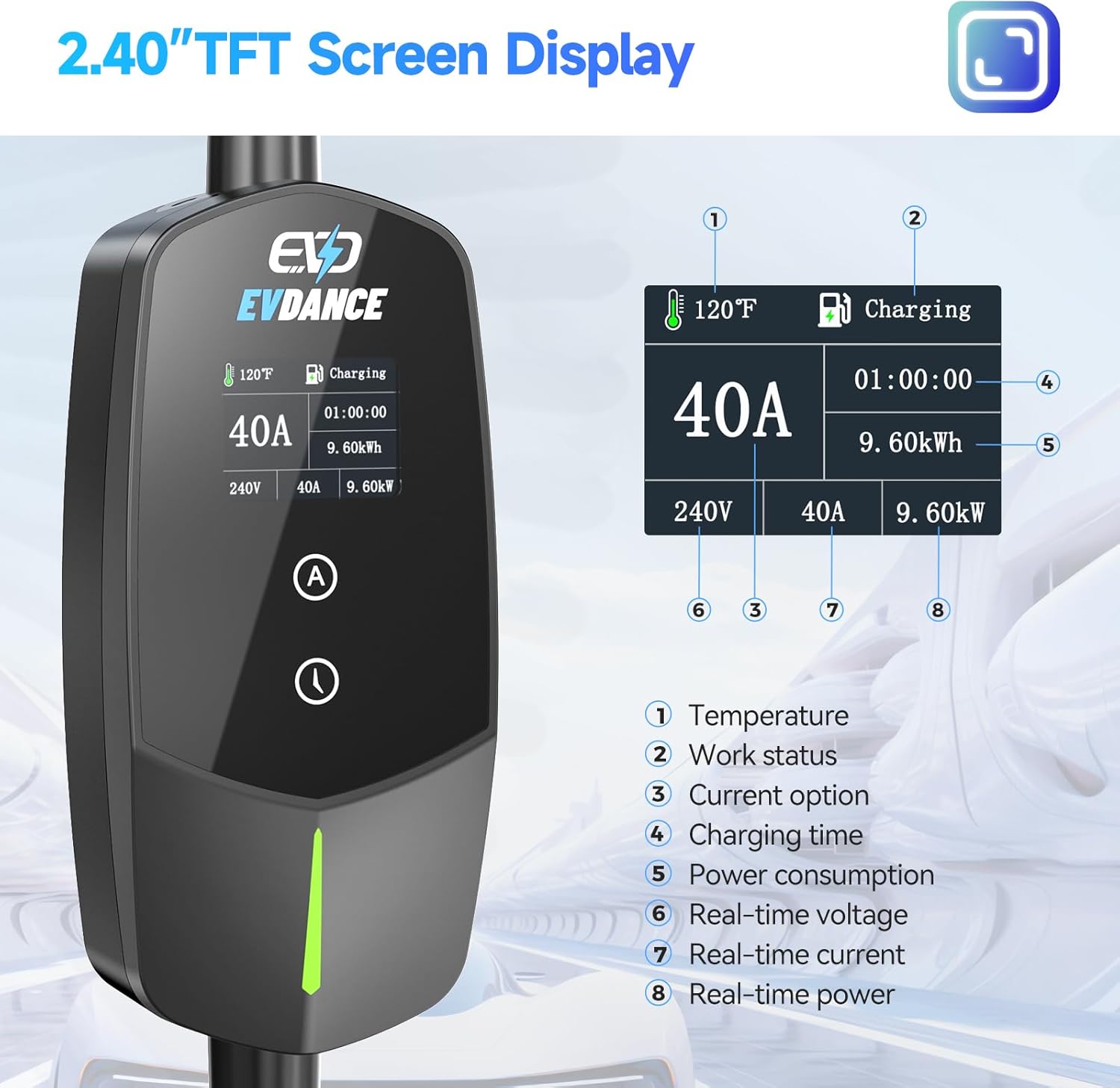 - Intelligent 2.4"" TFT Display & & LED Indicators: Our 40A electric car charger equipped with a large 2.4"" TFT screen, it provides clear and real-time charging information, including charging current/voltage/power kWh, charging time and work status, etc.The LED indicator on the control box provides real-time charging status