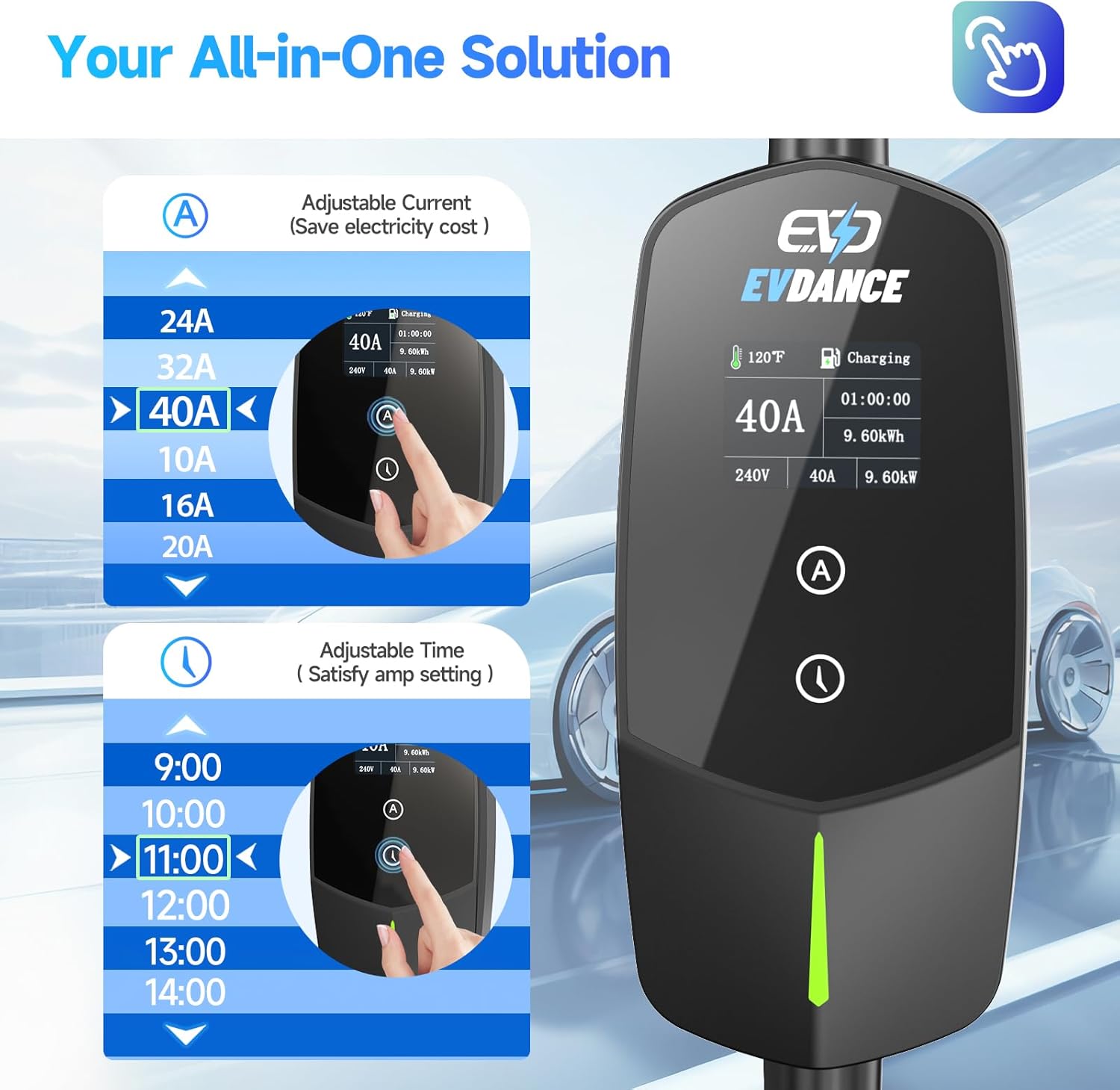 - Adjustable Charging Current: EVDANCE Level 2 charger supports adjustable currents settings ranging from 10A to 40A (10A/16A/20A/24A/32A/40A). Just touch the "A" button, you can easily select the appropriate charging speed to suit your specific needs