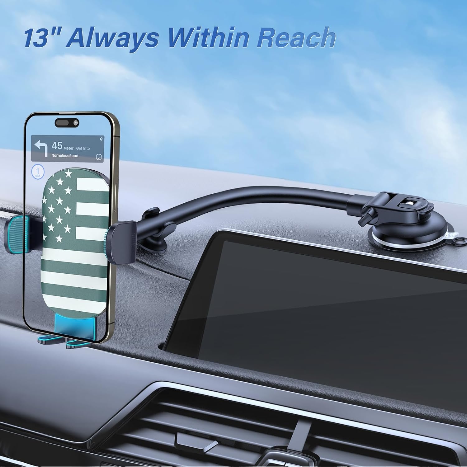 OQTIQ Phone Mount for Car [Gooseneck 13" Long Arm] Car Phone Holder for Dashboard, Windshield, Strong Suction Cup Cell Phone Holder for Car Truck (Patriotic Flag)