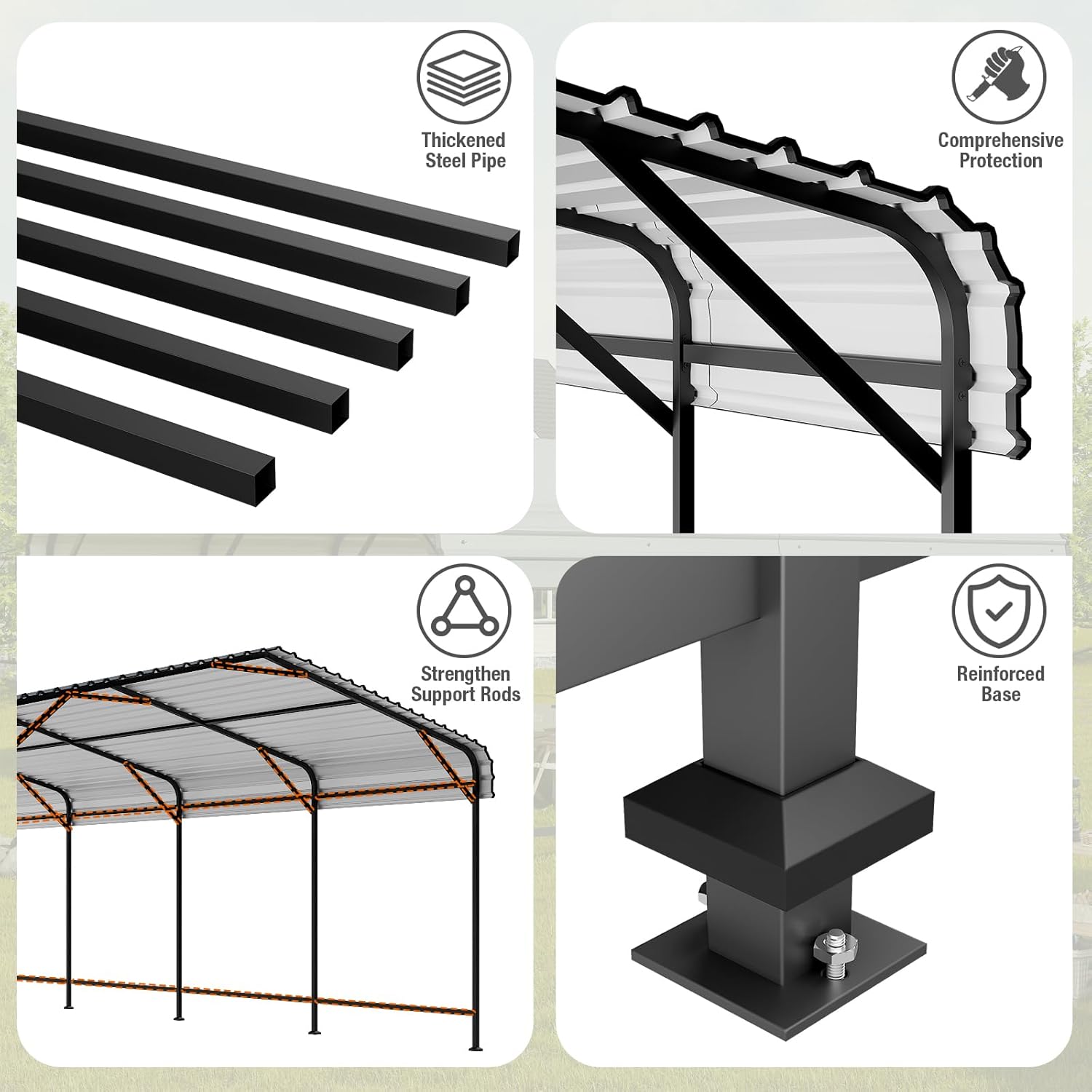 - REINFORCED BASE: The carport garage shelter is designed with a thickened base, and thickened metal steel pipes are connected between each two bases to enhance stability and adapt to various surfaces. With its excellent structural stability, this heavy duty carport can well protect your belongings and you can use it outdoors for a long time.