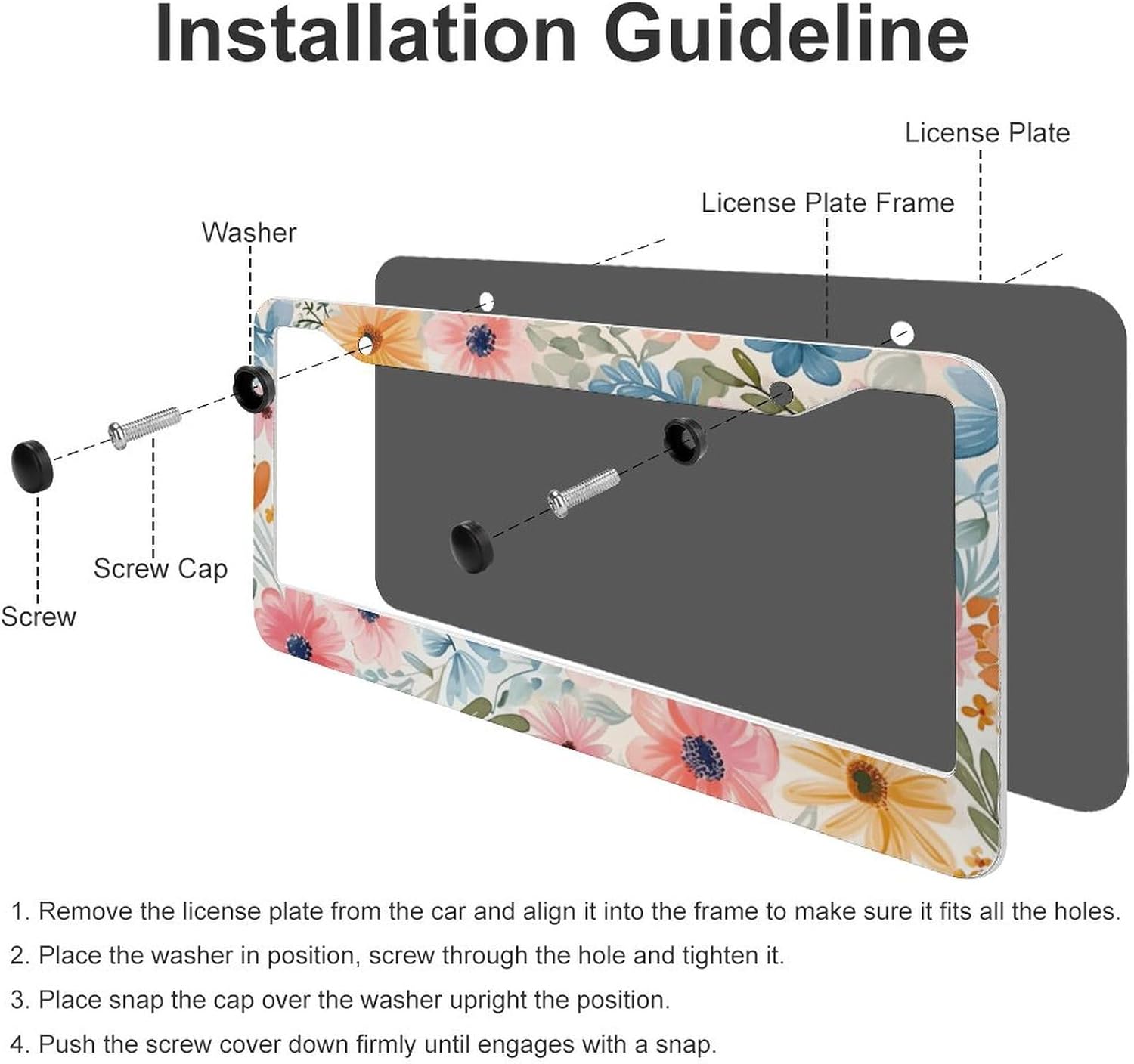 - ▶Quick Installation Design: Simply insert your license plate into the license plate holder and align the plate with the 2 holes on the frame for easy installation. The 2 Pieces aluminum flowers floral license plate frames accessories include 4 screw caps, 4 screws, 4 washers.