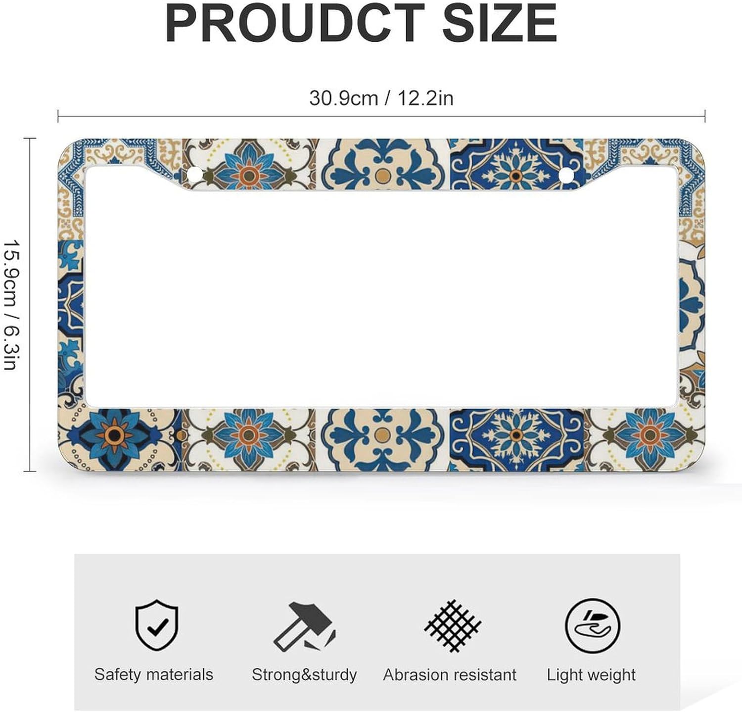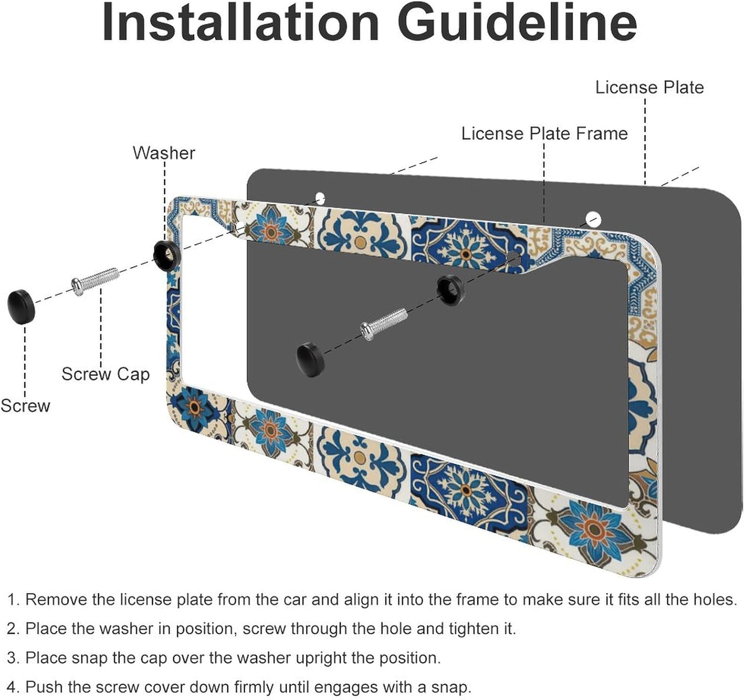 - ▶Quick Installation Design: Simply insert your license plate into the license plate holder and align the plate with the 2 holes on the frame for easy installation. The 2 Pieces aluminum boho mexican tile license plate frames accessories include 4 screw caps, 4 screws, 4 washers.