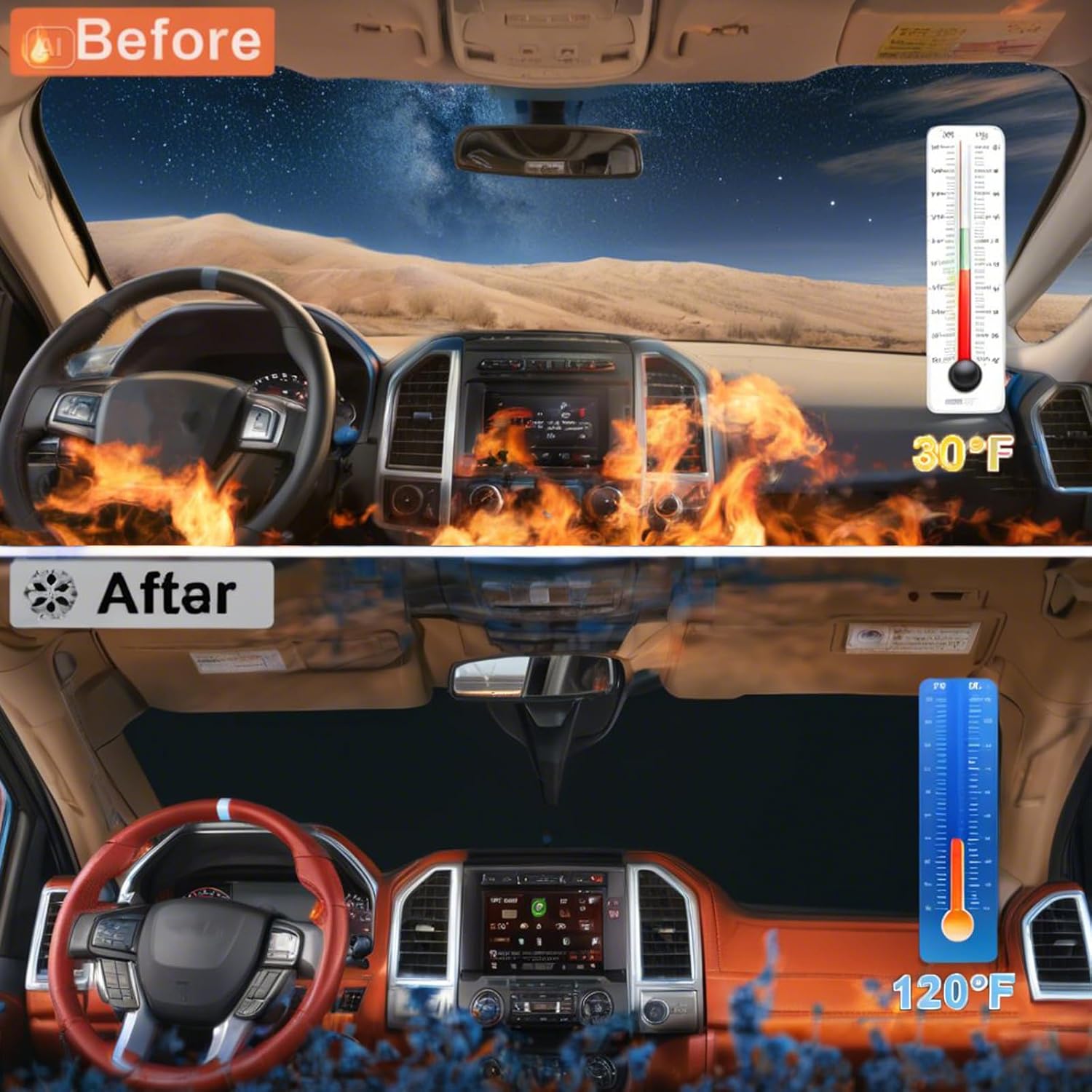 - Upgrade High Quality:Our for ford f150 sunshade upgraded black insulation + silver reflective layers block 99% harmful materials and reduce cabin heat by up to 60°F. Protect your steering wheel, dashboard, and seats from cracking, fading, or burning—even in extreme summer.