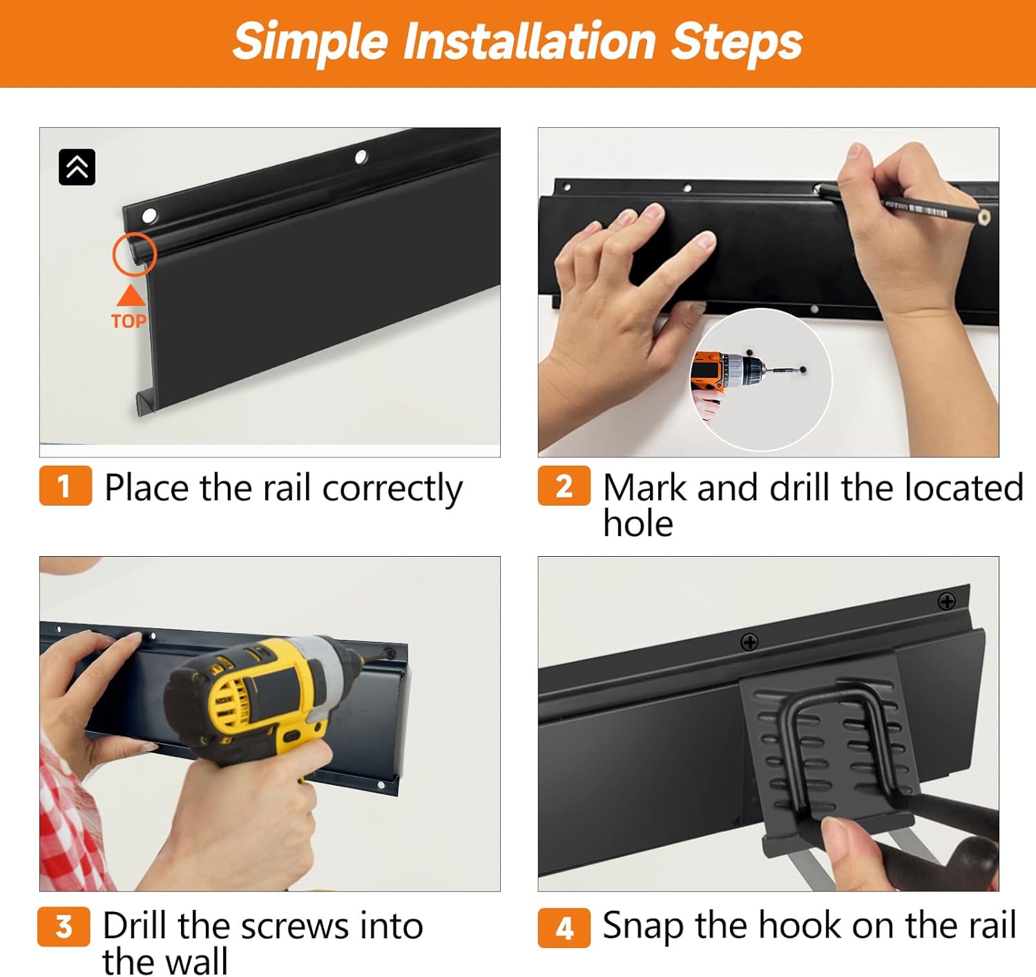 - Innovative Garage Tool Racks: Equipped With 3 Double-Layer Hooks, 3 Single Level hooks and 3 Rails, provides a reliable tool organizer wall mount solution, featuring durable carbon steel construction and multiple hanging options for effective organization