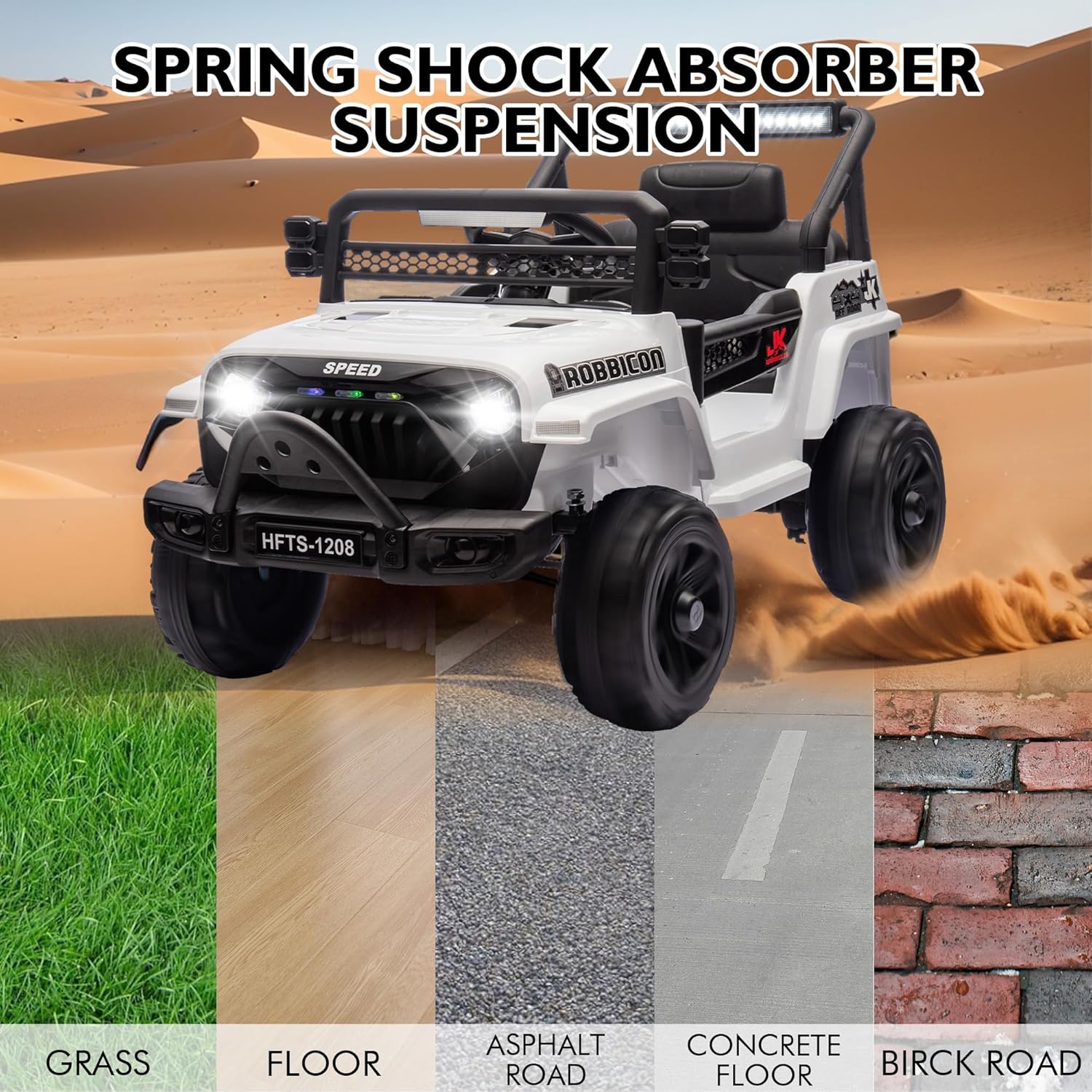- 🚗 【Advanced Four-Wheel Shock Absorption】This 12V ride-on truck features an advanced four-wheel shock absorption system that minimizes vibrations on uneven surfaces, providing a smooth and comfortable driving experience. The Kid's Ride On Car has a speed range of 0-3.11 MPH, allowing kids to enjoy a smooth and pleasant journey on both flat roads and bumpy paths.