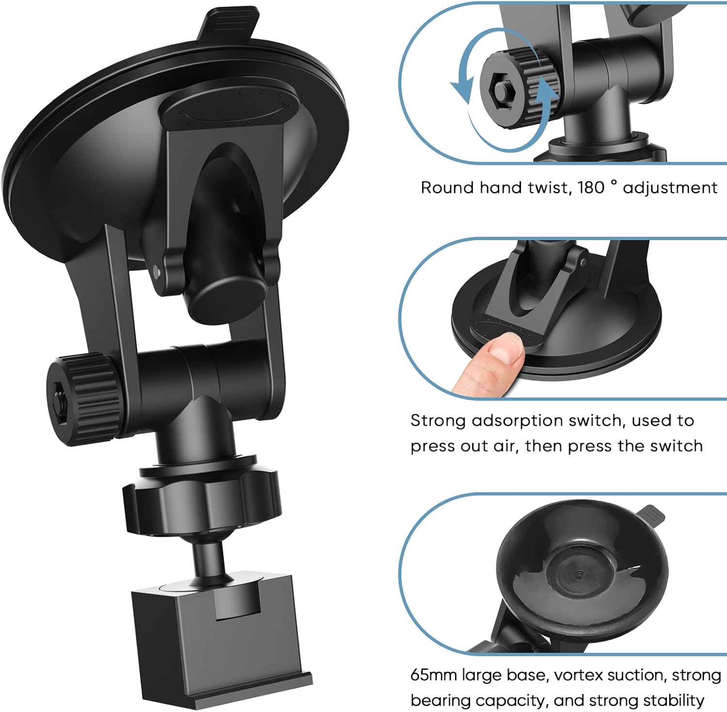 - ONE-PRESS WINDSHIELD SUCTION MOUNT :Upgraded windshield suction cup bracket with vacuum suction cup structure, capable of quick suction with a single press, and can be disassembled without damaging the glass.