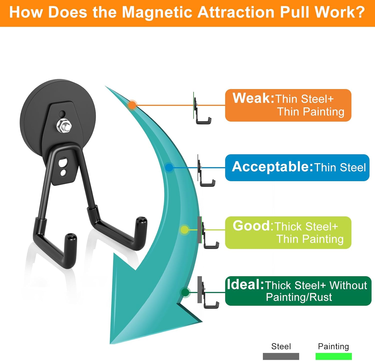 - Premium garage hooks: The industrial magnetic hooks for hanging are made of heavy-duty steel, and the double shape hooks are coated in a PVC layer to protect your tools from marring or scratching.