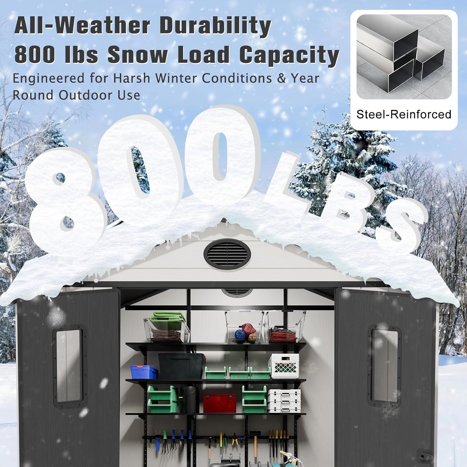 - ALL-WEATHER RESIN CONSTRUCTION: Built with 16mm thick dual-wall polypropylene panels reinforced by a powder-coated steel frame, this outdoor storage shed offers superior strength. Engineered to resist rain, UV rays, and rust while supporting up to 800 lbs of snow load