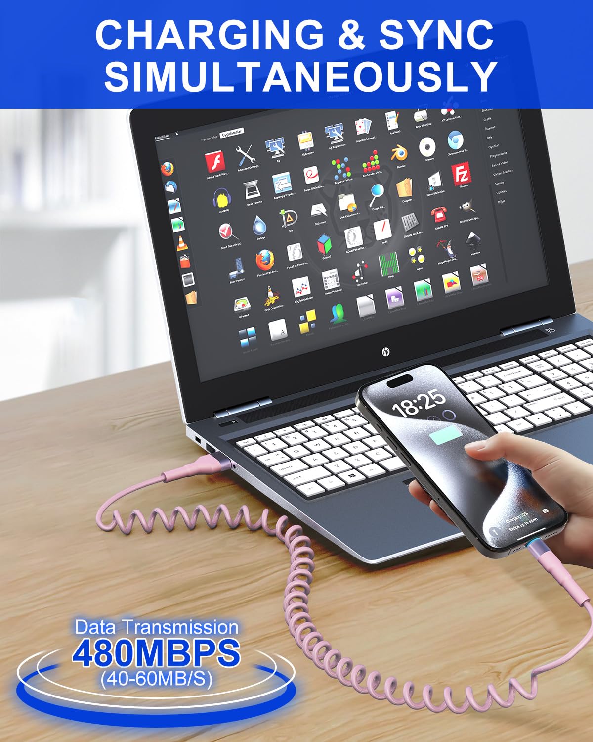 - Coiled Pink USB to Lightning Cable: The retractable spring design of the cable prevents tangling, keeping your car organized and tidy. Original Length - About 1.5ft/0.5m; Maximum Stretch - About 6ft/1.8m; Comfortable Stretch - 2ft~4ft/0.6m~1.2m
