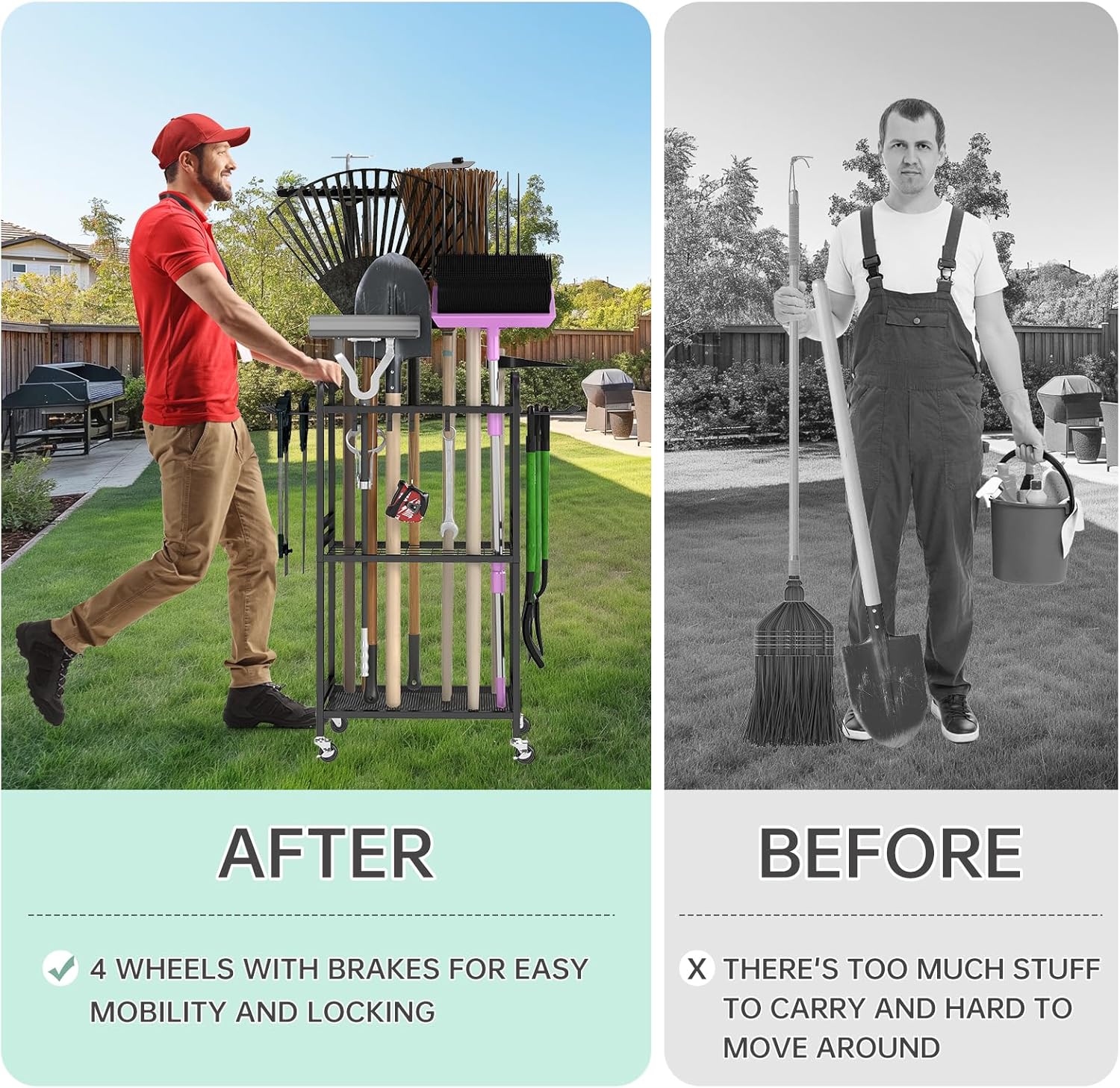 - Locking wheelsâmove freely: Unlike flimsy tool organizer that roll away on slopes, ours features smooth-gliding, lockable wheels! Simply engage the brake to stabilize the yard tool organizer for garage on grass, gravel, or uneven surfaces, preventing accidental slips. No other garden tool holder offers this much adaptable space-saving power