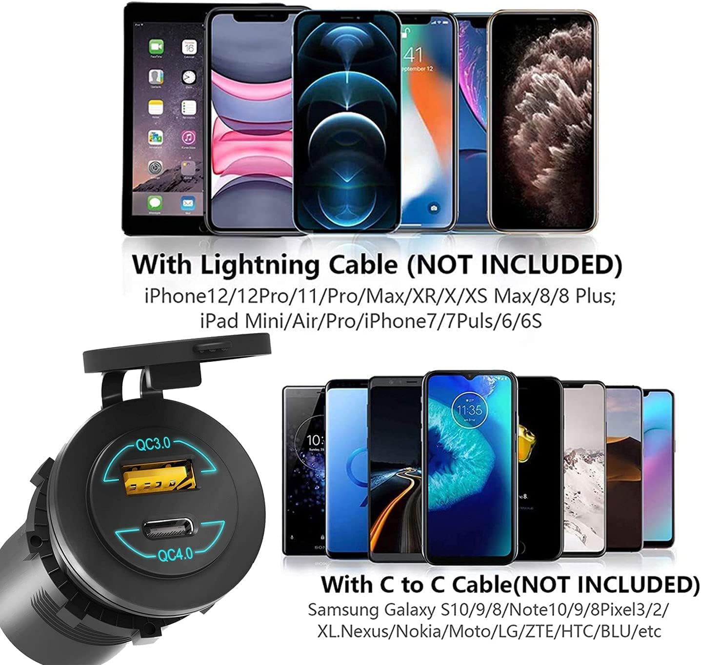 - ăDual-Protocol Fast ChargingăThis 12v usb outlet is equip with 60W QC4.0 PD Type-C & 36W QC3.0 USB-A ports, smart IC auto-detects devices for optimized output (5V/9V/12V/15V/20V). Charges laptop, Tablet at 20V/3A while simultaneously fast-charging Compatible with iPhone Series via PD protocol, Requires C-C/Lightning cables