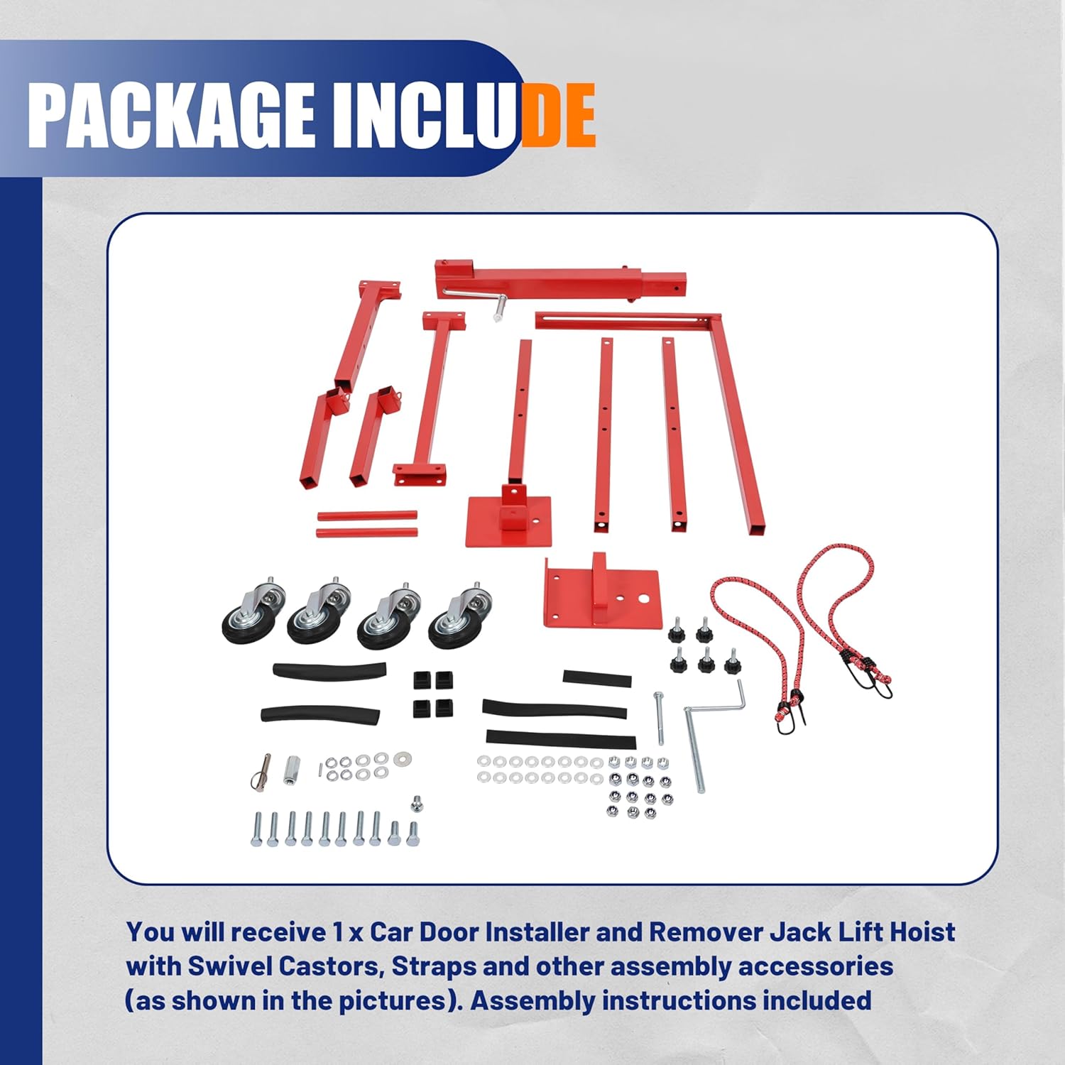 - Package Include: You will receive 1 x Car Door Installer and Remover Jack Lift Hoist with Swivel Castors, Straps and other assembly accessories(as shown in the pictures). Assembly instructions included