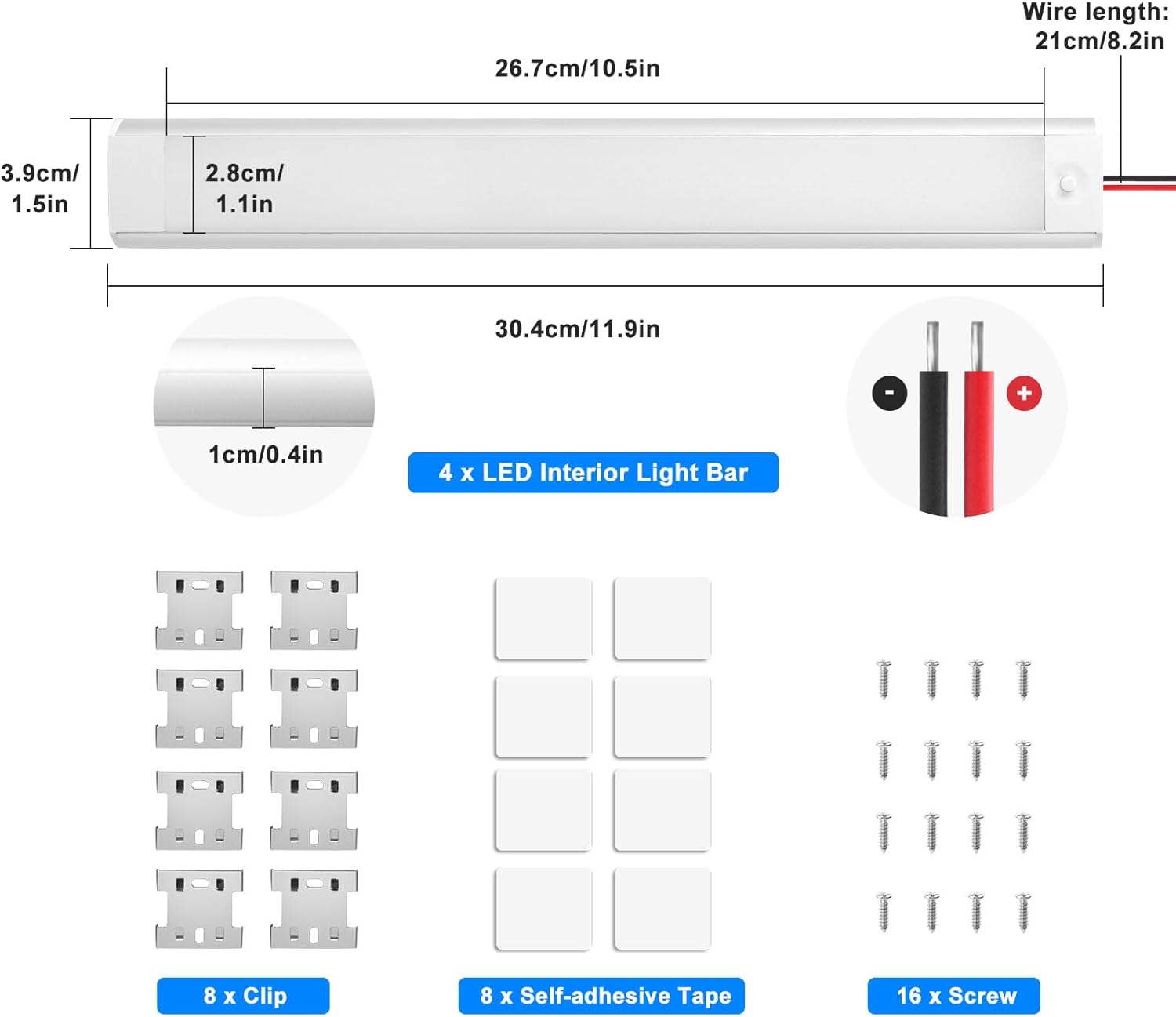 - Package Included: This DC 12V LED light set includes 4 x 108LED light bars, 8 x self-adhesive tapes, 8 x clips, and 16 x screws