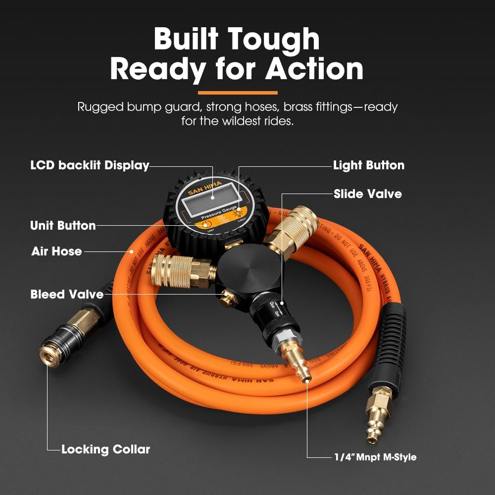 - Seamless Compatibility: Designed for flawless integration, this kit connects effortlessly to compressors with M-Style fittings, ensuring a smooth and consistent airflow. Both air hoses feature quick-connect tire chucks that slide back for easy attachment, lock securely onto the valve in seconds, and provide a hassle-free inflation and deflation experience.