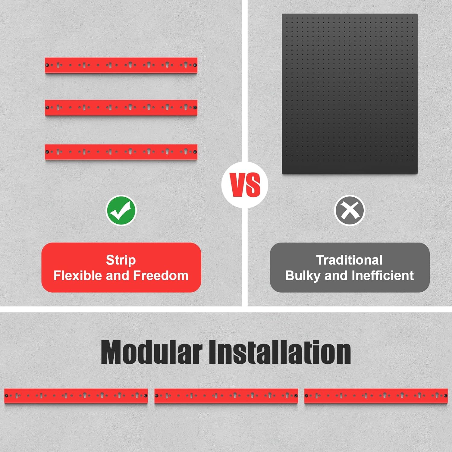 - Innovative transformation of large pegboards into pegboard strips, Avoid the embarrassment of not having enough wall space to install a large pegboard. pegboard strips are more flexible and don't take up much space. The pegboard holes will not be obscured by the tool.