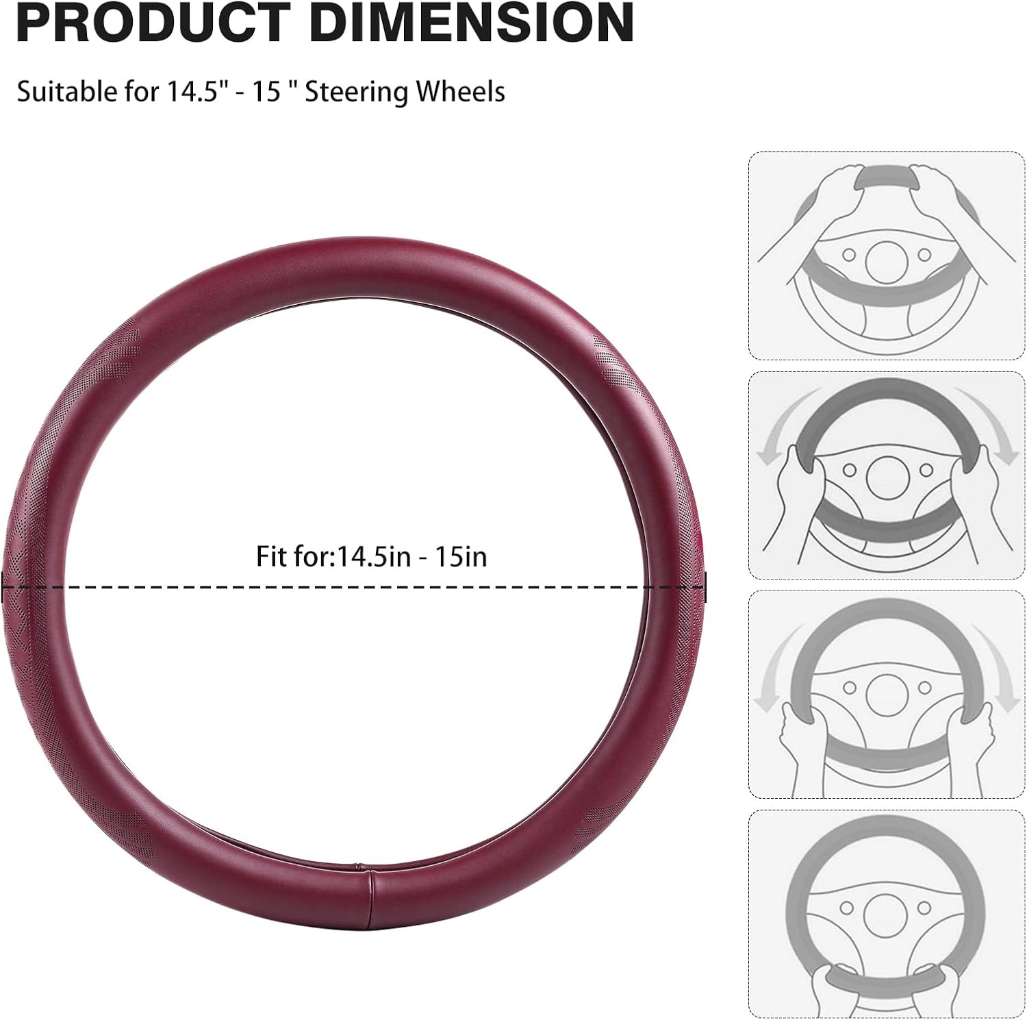 【2025 Model】 High-Grade Real Cowhide Steering Wheel Cover for Men Women,Wine Red Genuine Leather Steering Wheel Cover for Cars,Universal 14.5-15 inch Steering Wheels,Grid & Square Motif