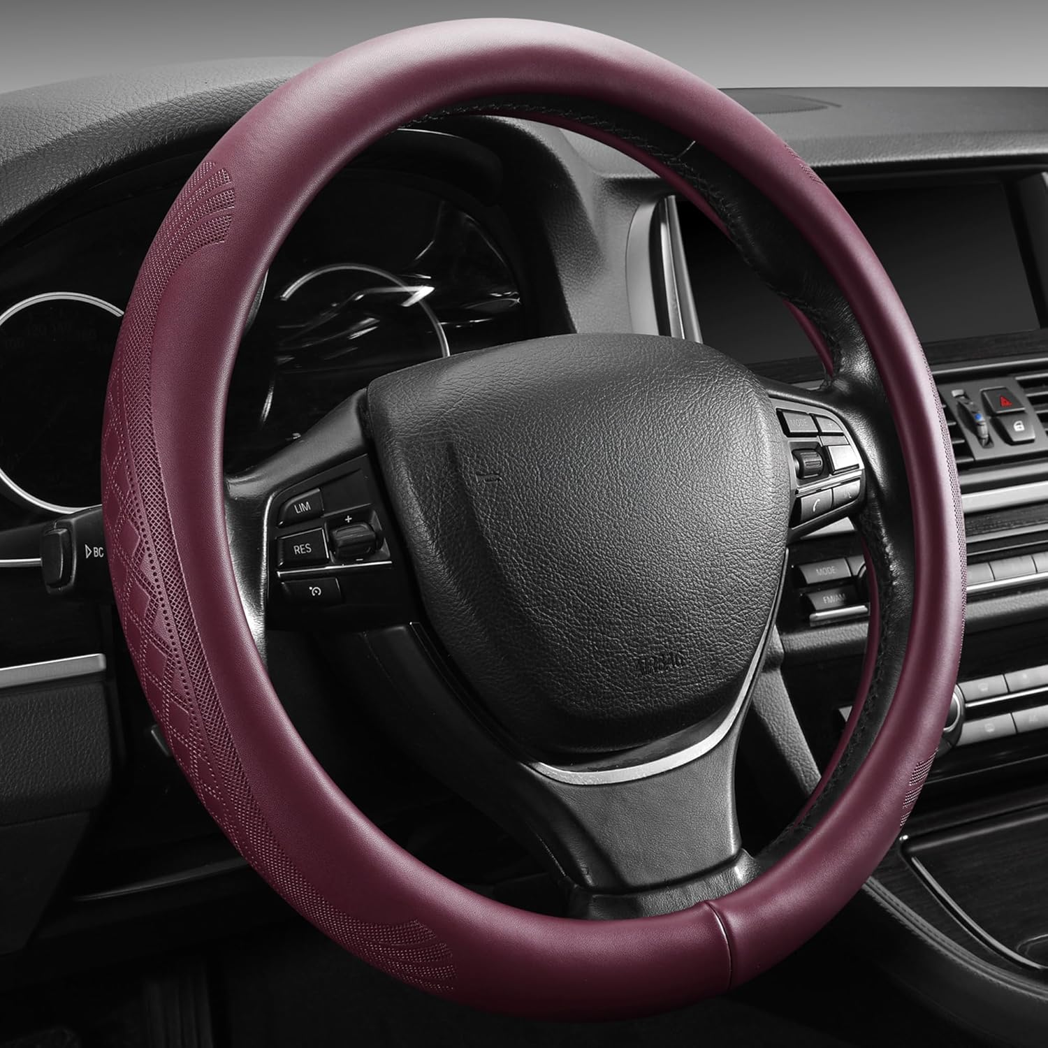 - 【Complete package】:The wine red real leather steering wheel cover is made of high-end cowhide. It is intact packaging, which keeps the original appearance of the product, without folds, and looks more beautiful.