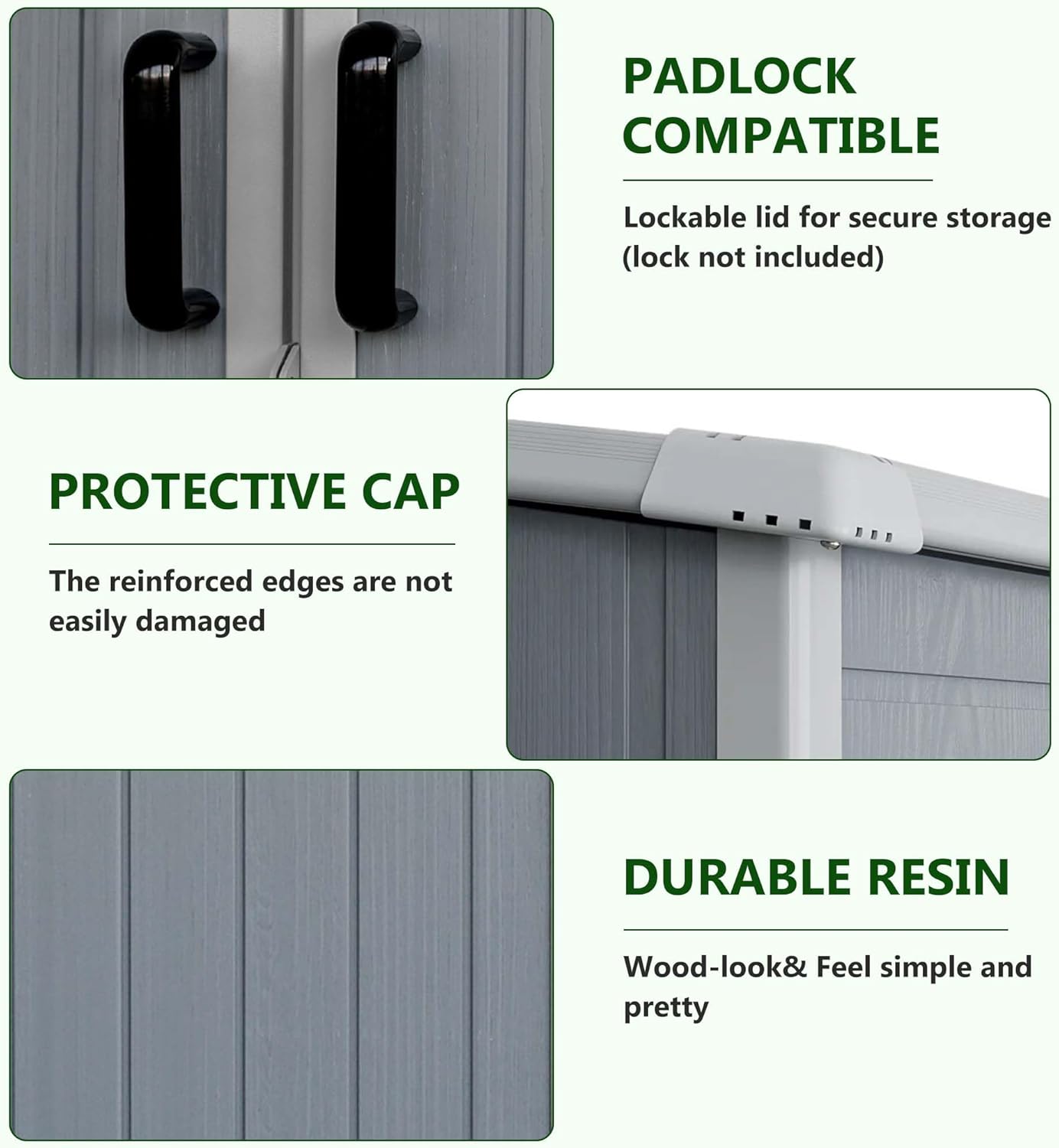 - Stylish and Durable Design: This outdoor shed with floor included features a modern wood grain veneer that combines aesthetics with practicality. Made of durable resin and metal, it not only looks great but also meets your outdoor storage needs with unique charm