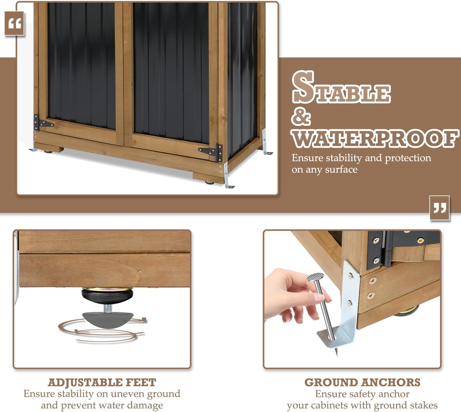 - Waterproof & Weatherproof: Our small outdoor storage cabinet is crafted from durable wood and metal to withstand rain, wind, and sun. This waterproof outdoor storage cabinet keeps belongings dry in gardens, balconies, or backyards year-round