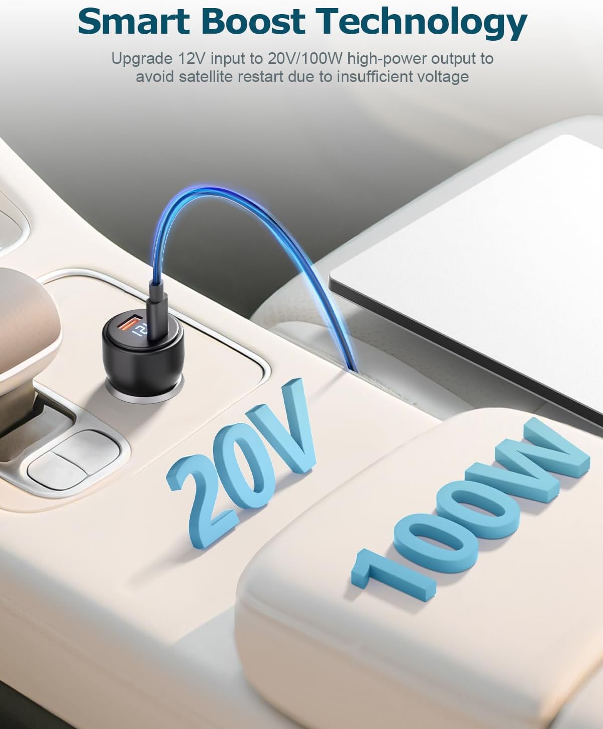 - 【What You Will Receive】1 * 10FT starlink mini usb c to dc power cable; 1 * cigarette lighter adapter 12v-24v . Starlink mini car charger adopts intelligent boost technology, which can output a maximum power of 20V/100W when the input voltage is greater than 12V. To avoid issues such as satellite restarts caused by insufficient voltage. It supports three in one power supply: charging starlink mini dish, USB-C (100W), and USB-A (18W) devices.