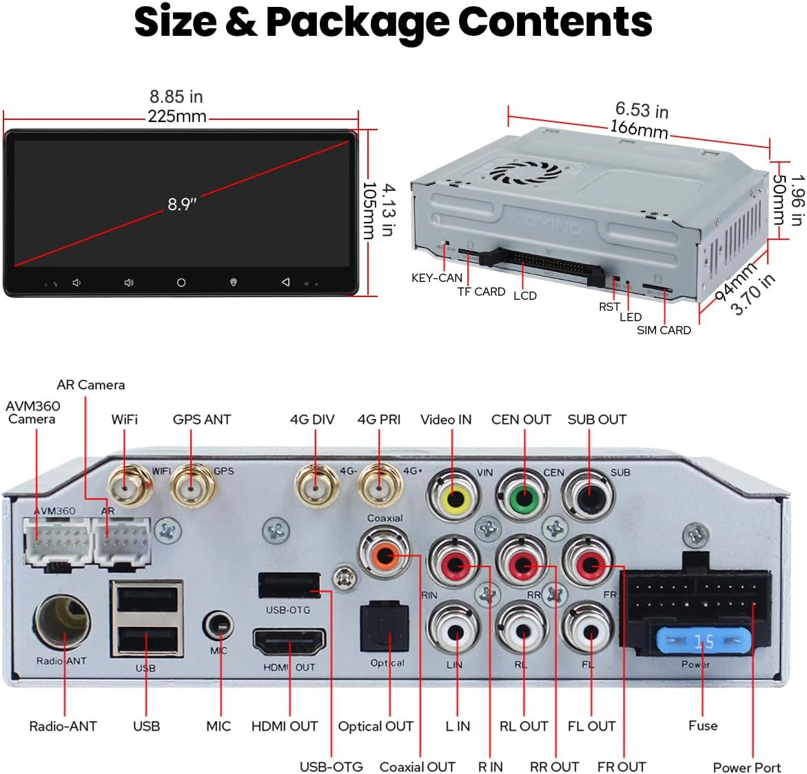 - Included Components : 8.9" radio*1, Single Din Cage*1, Mounting Sleeve*1, Left & Right Bracket*1, Plastic Trim Out*1, Extraction Keys*1, Installation Manual*1, WiFi Antenna*1, GPS Antenna*1, 4G Antenna*2, External Mic*1, USB Cable*2, AR Cable*1, Screen Ribbon Cable*1, ISO Cable *1, User Manual*1 8.9" radio*1, Single Din Cage*1, Mounting Sleeve*1, Left & Right Bracket*1, Plastic Trim Out*1, Extraction Keys*1, Installation Manual*1, WiFi Antenna*1, GPS Antenna*1, 4G Antenna*2, External Mic*1, USB Cable*2, AR Cable*1, Scr⌠See more