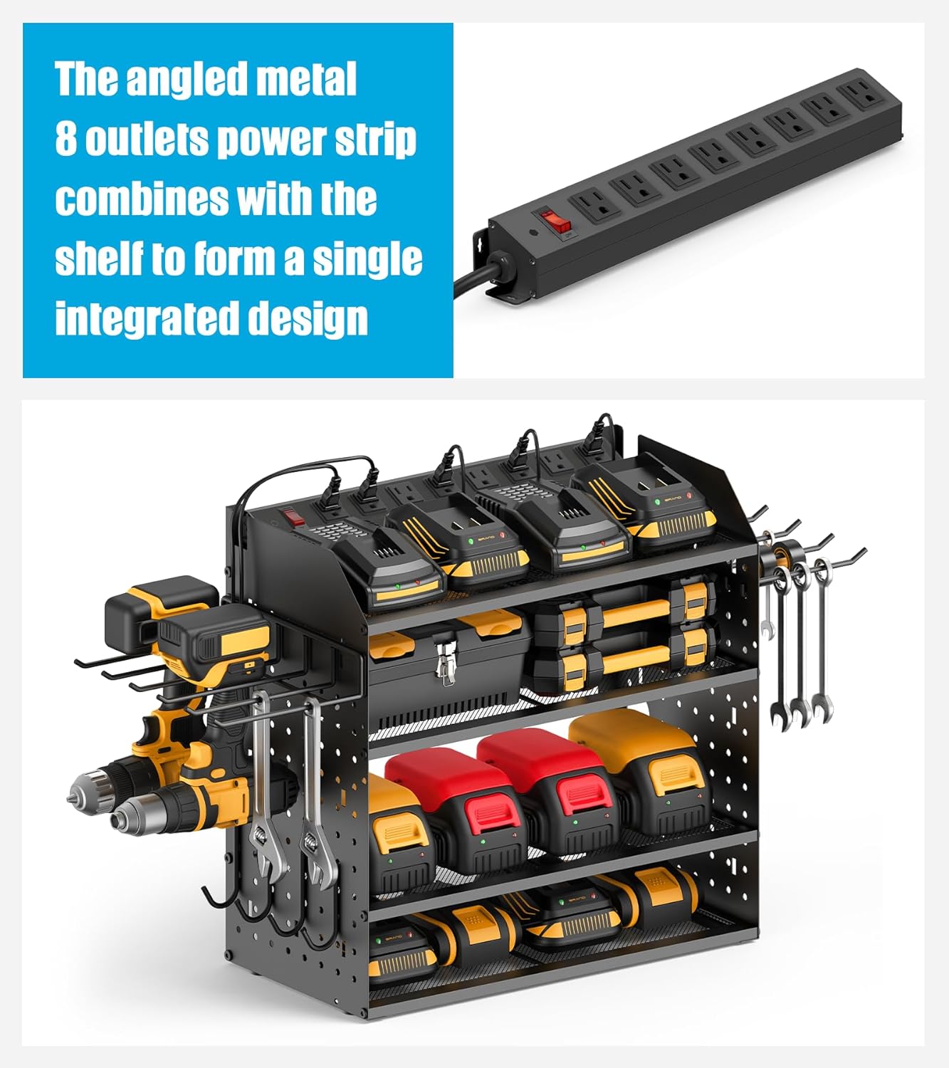- Garage drill and battery organizer and storage, Includes 8 angled power outlets built into the organizer. Features side cord holes to run charger cables up to the top outlets for power. Hides and manages cords at the same time.