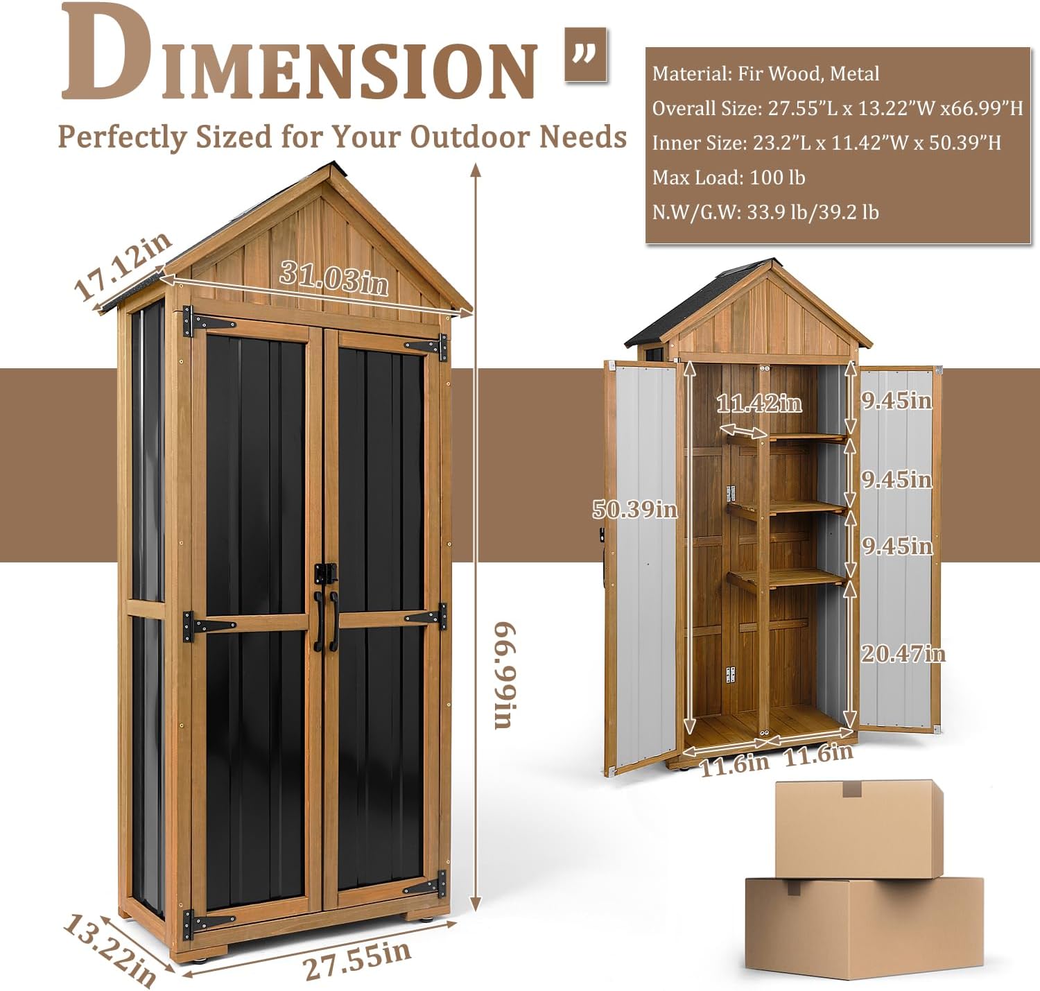 Outdoor Storage Cabinet Waterproof, Outdoor Storage Shed with Shelves, Wood & Metal Patio Backyard Garden Storage Cabinet Tool Organizer for Outside