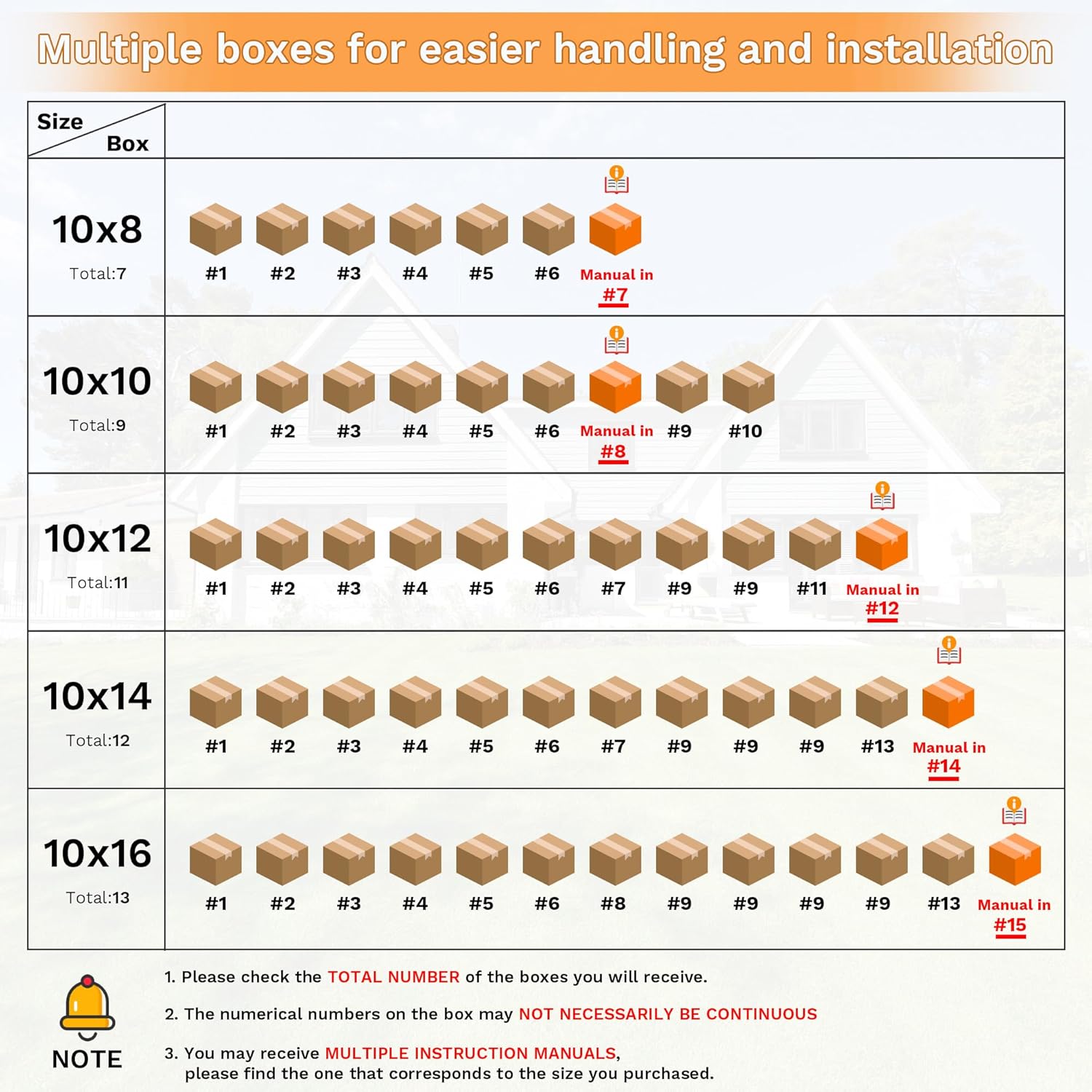 - Note: 1. Please check the policies of your community's homeowners association (HOA) to ensure that this project complies with relevant regulations. 2. The storage shed will be divided into 9 packages, numbered 1, 2, 3, 4, 5, 6, 8, 9, and 10, excluding package 7, which may be delivered in batches. You can scan the QR code on the package or contact us for information about other packages.