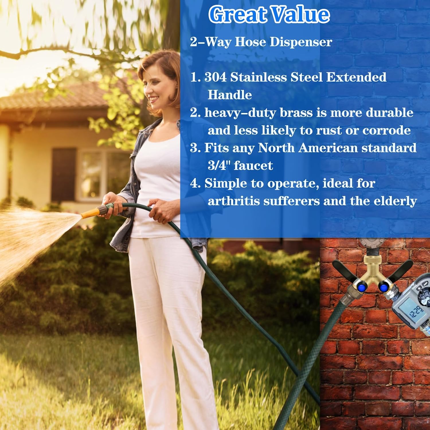 - 【Adapted to standard interfaces】Inlet is GHT 3/4-inch female thread, 2-way outlet is GHT 3/4-inch male thread, compatible with any North American standard 3/4-inch faucet, garden hose fitting, watering fixture, and maintains long term stable operation and water tightness.